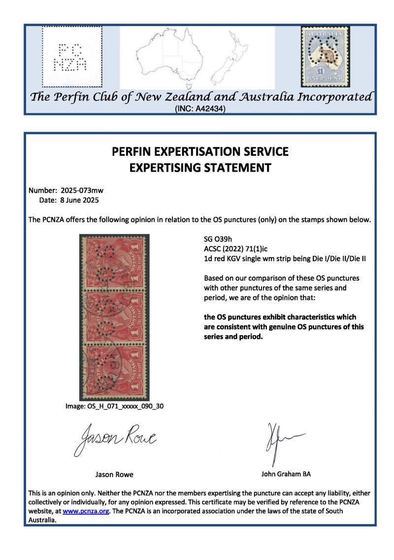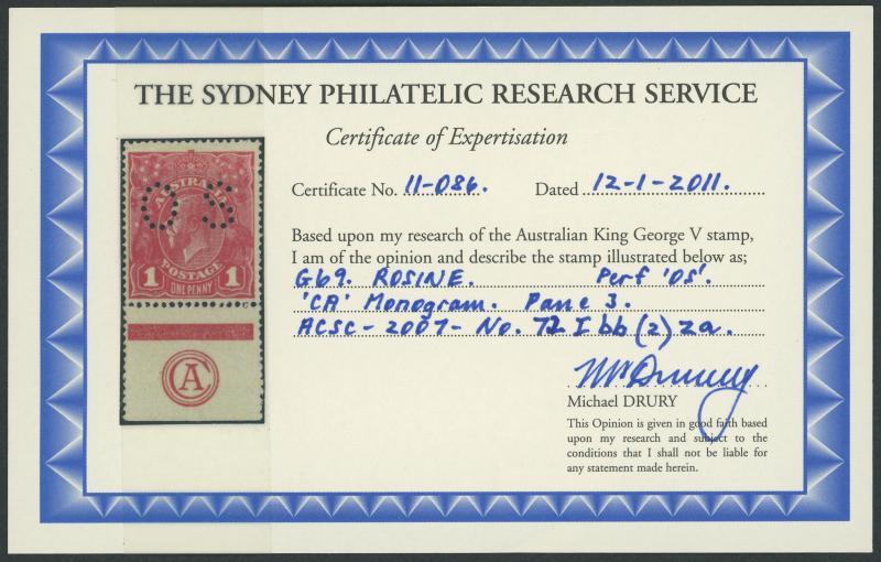 1424 og image1d rosine G68 Rough Paper ACSC 72Ibb (SG O54c) Plate 2 'CA' Monogram single ACSC 72(2)za, light stain at upper-right, small hinge remainder, Cat $2000. Michael Drury Certificate (2011). Ex Graeme Stephensen. (Image1) (Image2) (Image3)