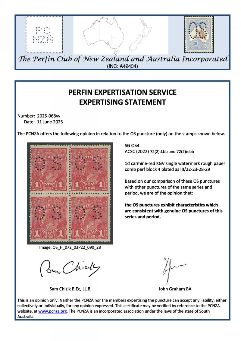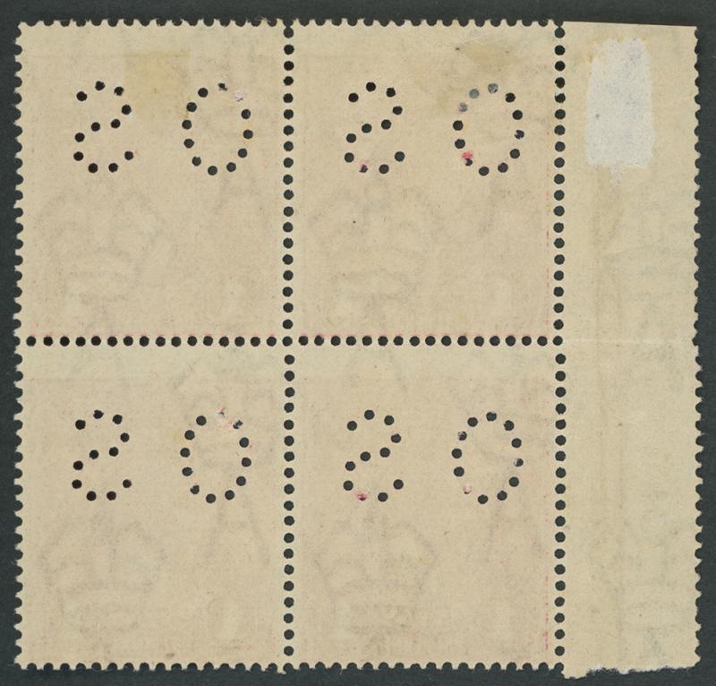 1423 og image1d carmine-red G73 Rough Paper ACSC 72Pbb (SG O54 shade variant) Plate 2 block of 4 the right-hand units with 'PENAVY' and Rusted Top Right Corner [Pos III/23/29] ACSC 72(2)d & e, small hinge remainders & a tiny patch of gum loss, Cat $750+ for two unpunctured varieties & two punctured singles. PCNZA Certificate (2025). Ex Arthur Gray - sold at our auction of 26.5.2016 for $521 (Sale 213 Lot 134) - and Graeme Stephensen. (Image1) (Image2) (Image3)