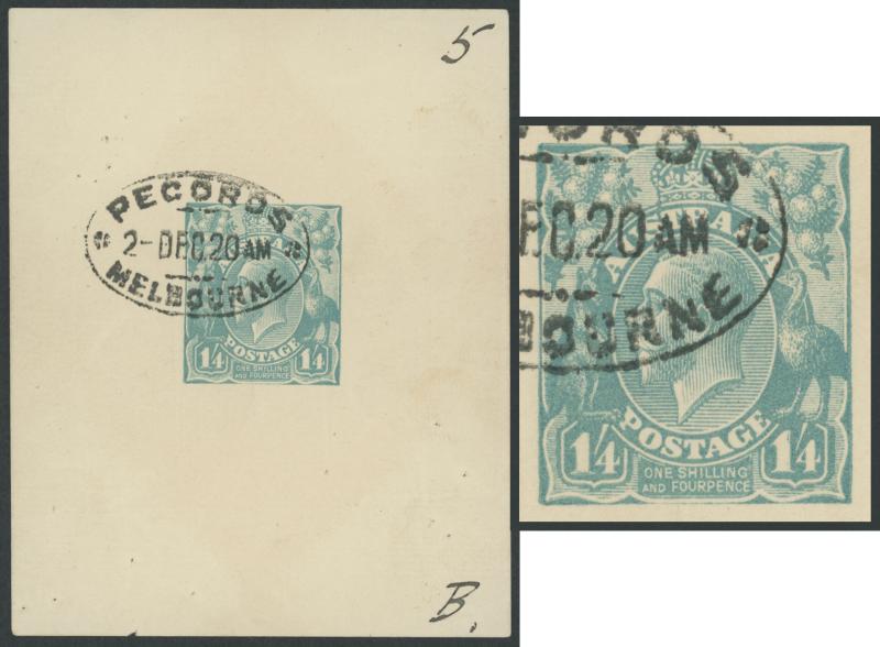 1418 P image1/4d die proof in turquoise-blue on white wove paper with 'RECORDS/* 2-DEC 20 AM */MELBOURNE' oval datestamp in black and endorsed "5" at upper-right & "B" at lower-right ACSC 128DP(1)B, the paper (69x87mm) with multiple pin-holes but the impression is unaffected and superb, Cat $50,000. The unique example in private hands illustrated by the ACSC at p266; the only other known proof being in the Australia Post Archival Collection. Ex JB Williamson & The Morgan Collection: sold in 2012 for £42,000. (Image1)