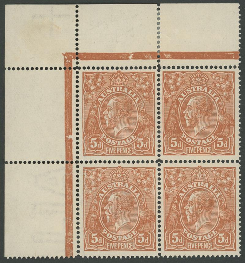 1412 nh image5d chestnut Smooth Paper Single Line Perf SG 23 marginal block of 4 from the upper-left corner of the left-hand pane with Eight Wattles at Right [Pos L1], White Spot between 'L' & 'I' of 'AUSTRALIA' [Pos L2] and White Flaw in Upper-Left Frame [Pos L7] ACSC 122d, e & g, exceptionally well-centred for this issue, some perf reinforcing & hinge remainders in the upper margin, the stamps unmounted, Cat $1500+ for normal unmounted singles. Gerald Fon's similarly well-centred unmounted single - without variety - sold at our auction of 24.6.2025 for $432 (Sale 260 Lot 526). (Image1) (Image2)