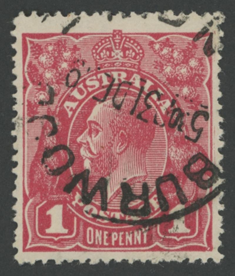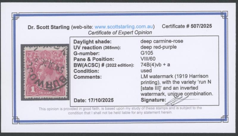 1429 G image1d deep carmine-rose Harrison Printing with the Watermark Inverted ACSC 74a (SG50aw) and with Run 'N' of 'ONE' Third State [Pos VIII/60] ACSC 74(4)vb, 'BURWOOD/31DE19/NSW' cds, Cat $5000 (£3000). The current edition of the ACSC quotes a used price of "$500" in error. Scott Starling Certificate (2025) states "unique combination". (Image1) (Image2) (Image3)