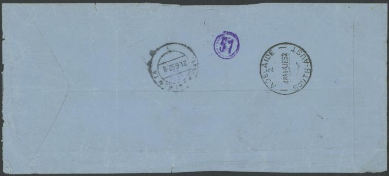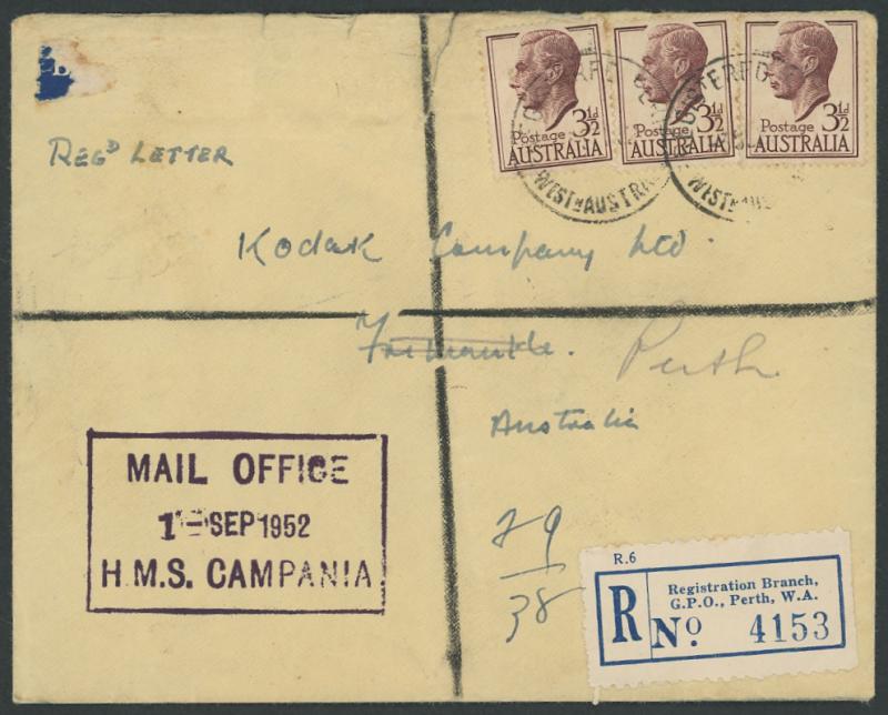 1740 c image1952 (Sep 1) commercial cover with superb boxed 'MAIL OFFICE/1SEP1952/HMS CAMPANIA' datestamp, to Kodak in Perth with KGVI 3½d brown x3 cancelled on arrival with 'REGISTERED PERTH/4SEP52/...' cds, blue/white R label at lower-left & airmail label at upper-left removed for being unnecessary, repaired 20mm tear at centre-top & minor blemishes. A rare cover. Ex George Speirs. It seems probable that the cover was carried in a closed bag by ship to Fremantle & Perth. 'Campania' was flagship of the five Royal Navy vessels that sailed from Portsmouth to the uninhabited Monte Bello Islands, 120km north of Onslow, on the NW coast of Western Australia. On 3.10.1952, the British exploded an atomic bomb there. Two more bombs were exploded on 16.5.1956 & 19.6.1956, these being the largest explosions ever in Australia. The last of them created six times the energy of the bomb dropped on Hiroshima. (Image1) (Image2)