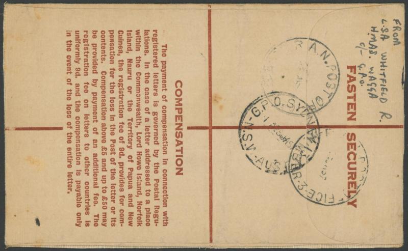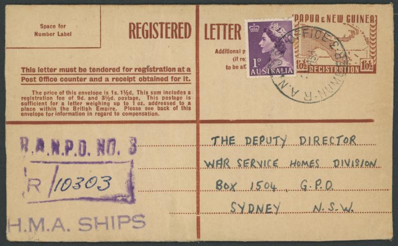 1746 PSE image1957 commercial usage to Sydney of Papua New Guinea 1/0½d Registration Envelope with Australian 1d added & tied by 'RAN POST OFFICE/23JA57/NUMBER 3' cds used at HMAS Tarangau on Lombrum Island, fine 'RANPO NO 3' registration cachet & 'HMA SHIPS' cachet both in violet, sender's address "HMAS WAGGA" on the flap, opened-out for display. A remarkable combination franking item. Ex Clifford Crush: sold at our auction of 12.2.2010 for $870 (Sale 153 Lot 805). (Image1) (Image2)