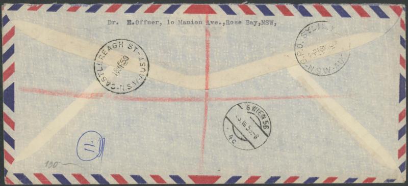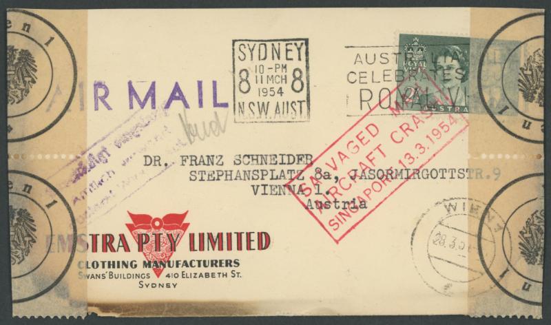 1743 c image1954 (Mar 11) clothing manufacturer's cover to Austria with Royal Visit 2/- tied by Sydney Royal Visit slogan cancel and boxed 'SALVAGED MAIL/AIRCRAFT CRASH/SINGAPORE 13.3.1954' cachet in red, minor fire damage at lower-left & repaired at both ends with Austrian resealing labels. (Image1) (Image2)