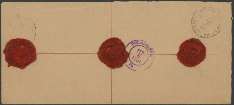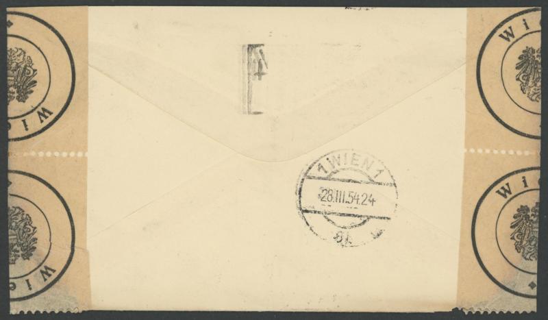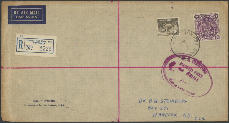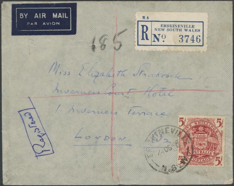 1734 long cover image1950-59 registered airmail covers with Arms frankings comprising 1) 1950 Great Britain with 5/- solo with the 6d registration fee unpaid but not taxed; 2) 1954 to USA with 5/-, 9d and 1/- paying triple 2/- ½oz plus 9d; 3) 1958 to USA with 10/- and 9d paying quintuple 2/- ½oz underpaying 1/3d registration fee and 4) 1959 to Austria with 5/- and 9d paying double 2/3d ½oz plus 1/3d registration fee. Scarce quartet. (4) (Image1) (Image2) (Image3) (Image4) (Image5) (Image6) (Image7)