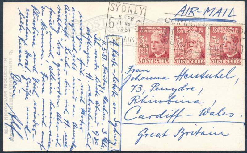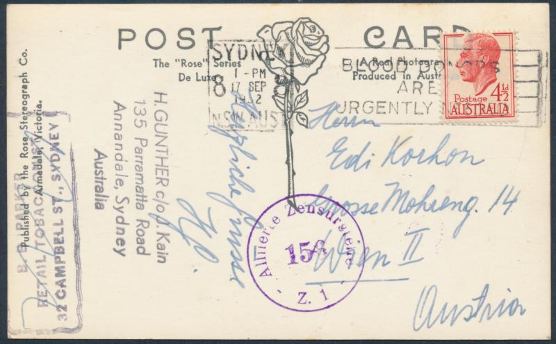 1741 c image1952 (Sep 17) PPC by surface mail to Austria with scarce franking of KGV 4½d Red (Cat $400 for solo franking) tied by 'BLOOD DONORS/...' slogan of Sydney, Allied Censor Cachet in violet. Civil Censorship in Austria was lifted only on Aug 15 1953. (Image1) (Image2)