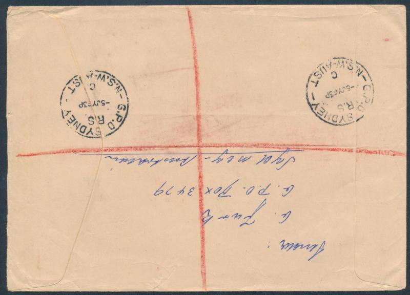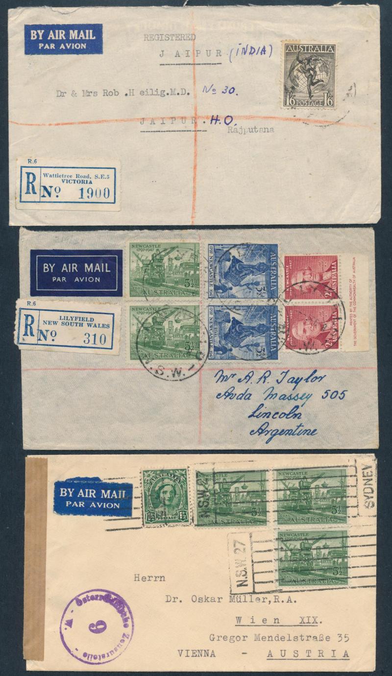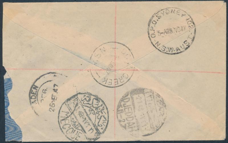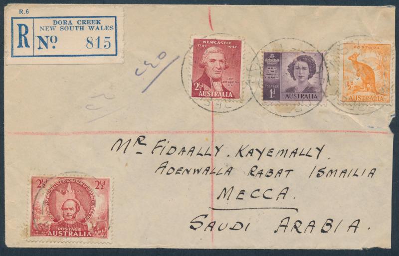 1731 c image1947 (Nov 28) cover to Saudi Arabia with ½d 1d & 2½d tied with light 'DORA CREEK/NSW' cds, blue/white registration label, reverse with bilingual '.../2.1.48/JEDDAH/R-2' transit and '.../3.1.48/MECQUE' arrival cds, minor faults. Rare destination. (Image1) (Image2)