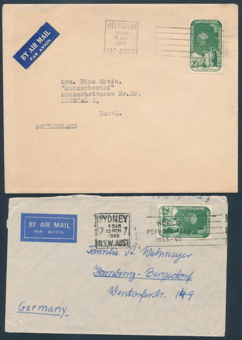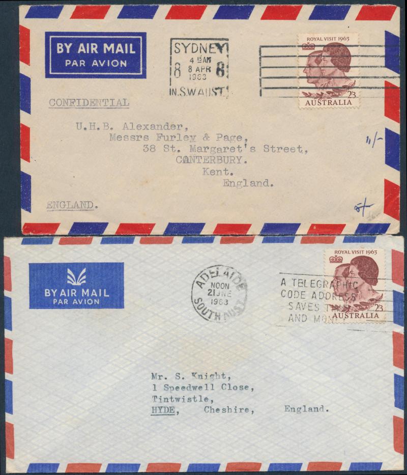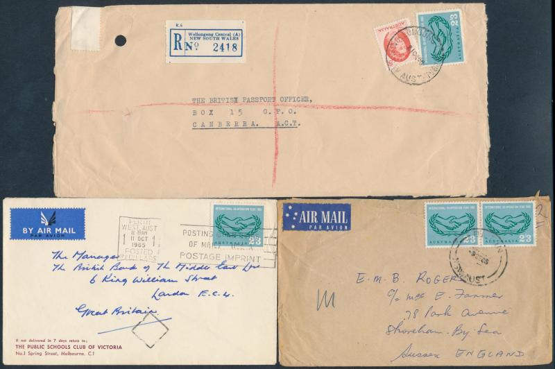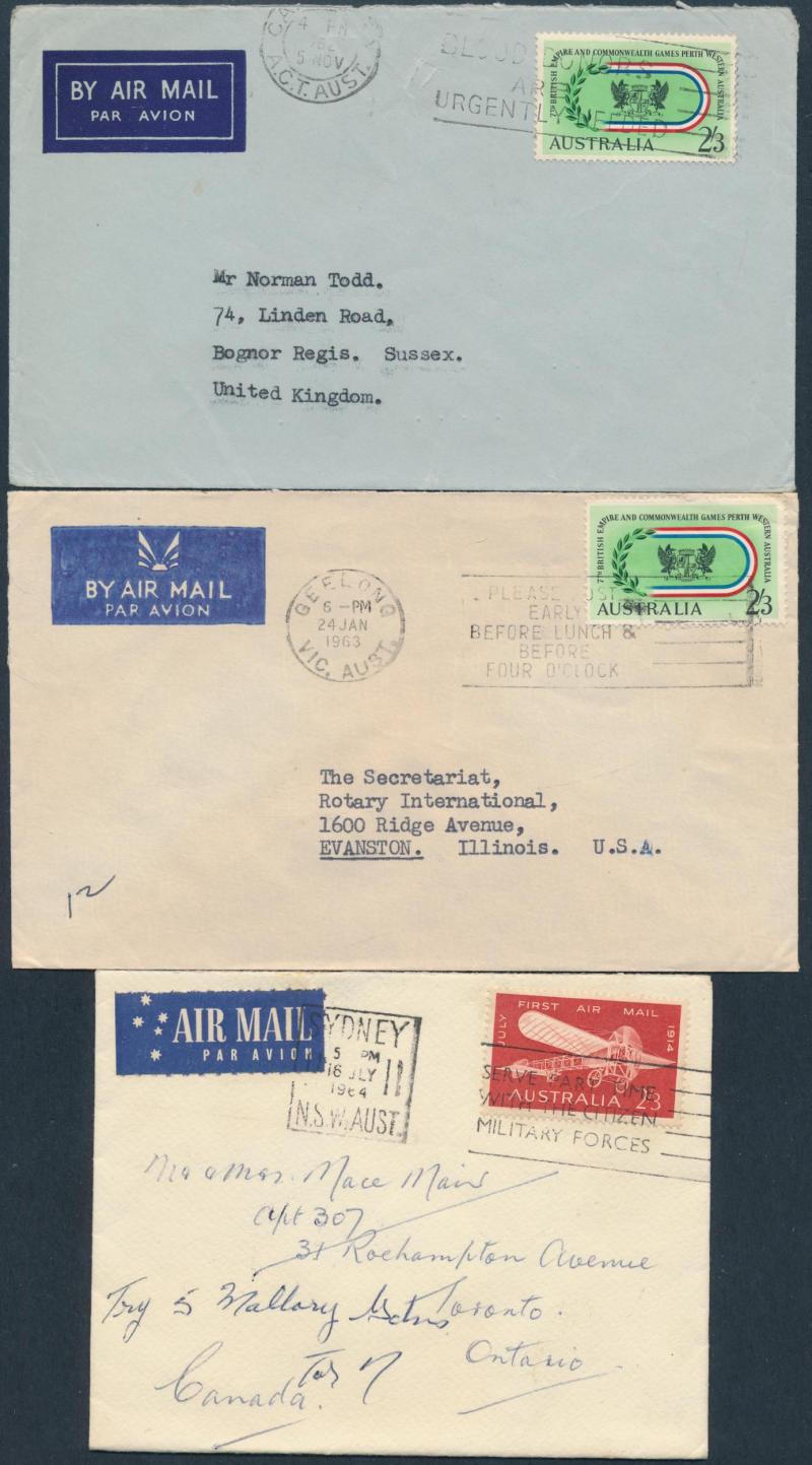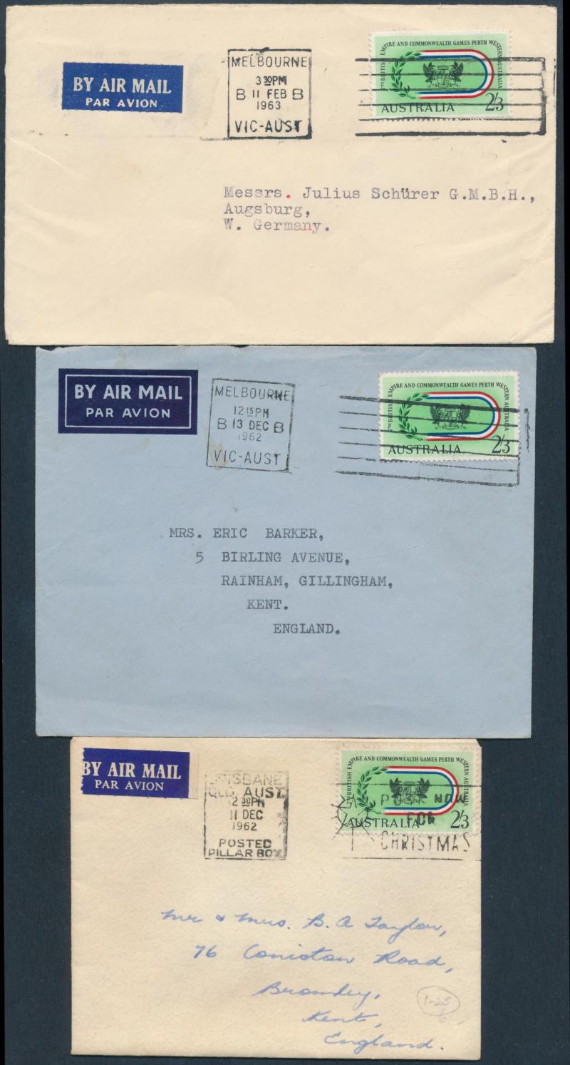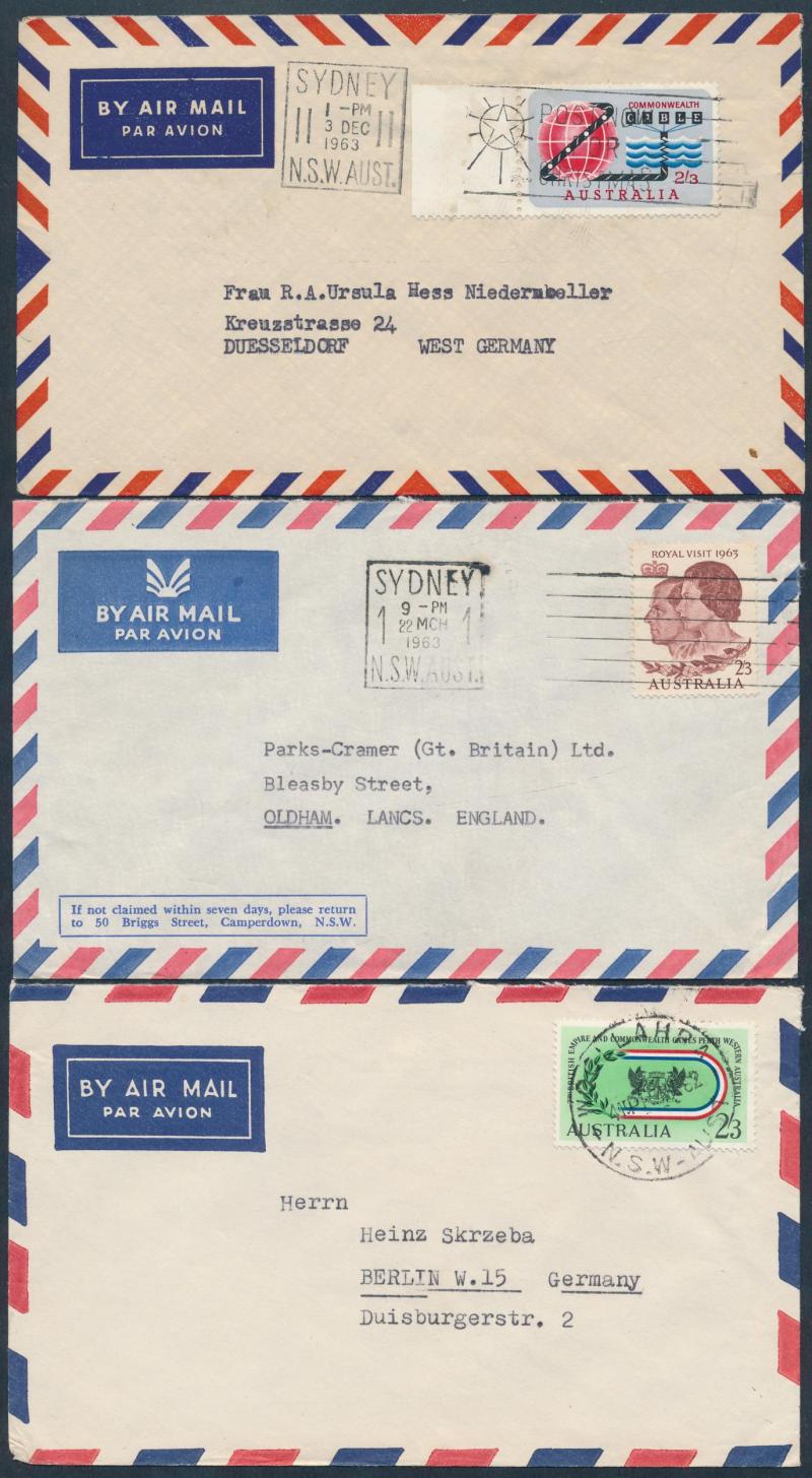 1747 c/long cover image1962-65 2/3d Commemoratives usages including Empire Games solos airmail to England, to Germany & to USA (overpaid), Royal Visit solo airmail to England and with 2/- Flower registered airmail to Germany, Cable solo to Germany and with 5d Christmas on domestic second weight-step registered, Airmail solos to England, to France on UNICEF envelope & to Canada (overpaid), ICY solo & pair both to England, pair to Switzerland plus with QEII 5d red domestic second weight-step registered, also AAT Penguin solos airmail to England, Germany & to Switzerland, the majority on standard-size envelopes, condition generally fine to very fine. (25) (Image1) (Image2) (Image3) (Image4) (Image5) (Image6) (Image7) (Image8) (Image9) (Image10) (Image11)