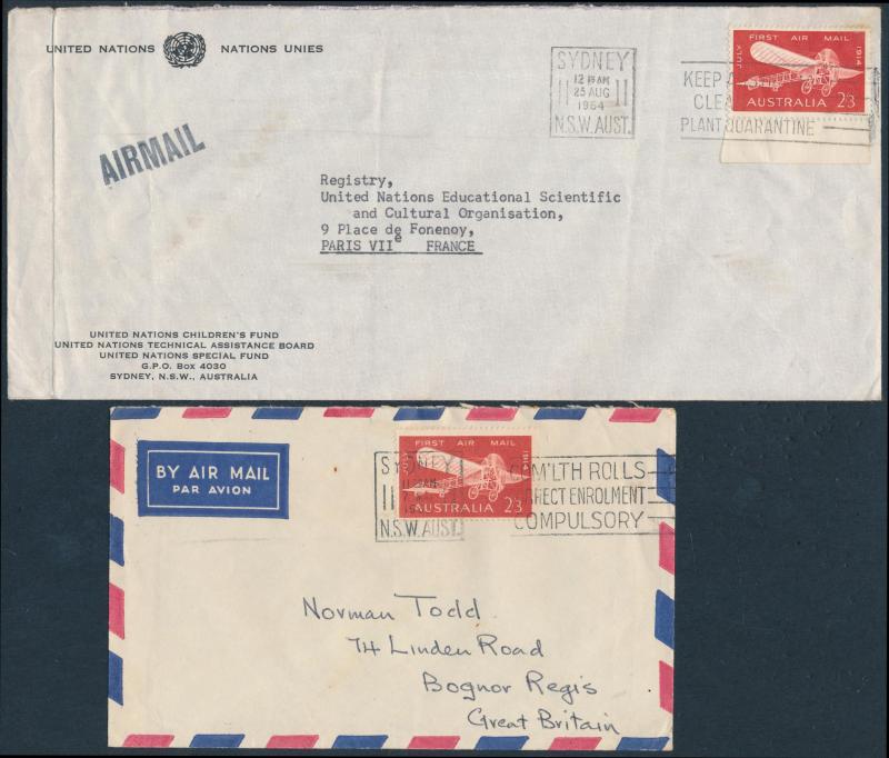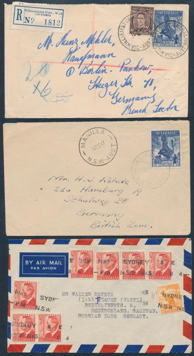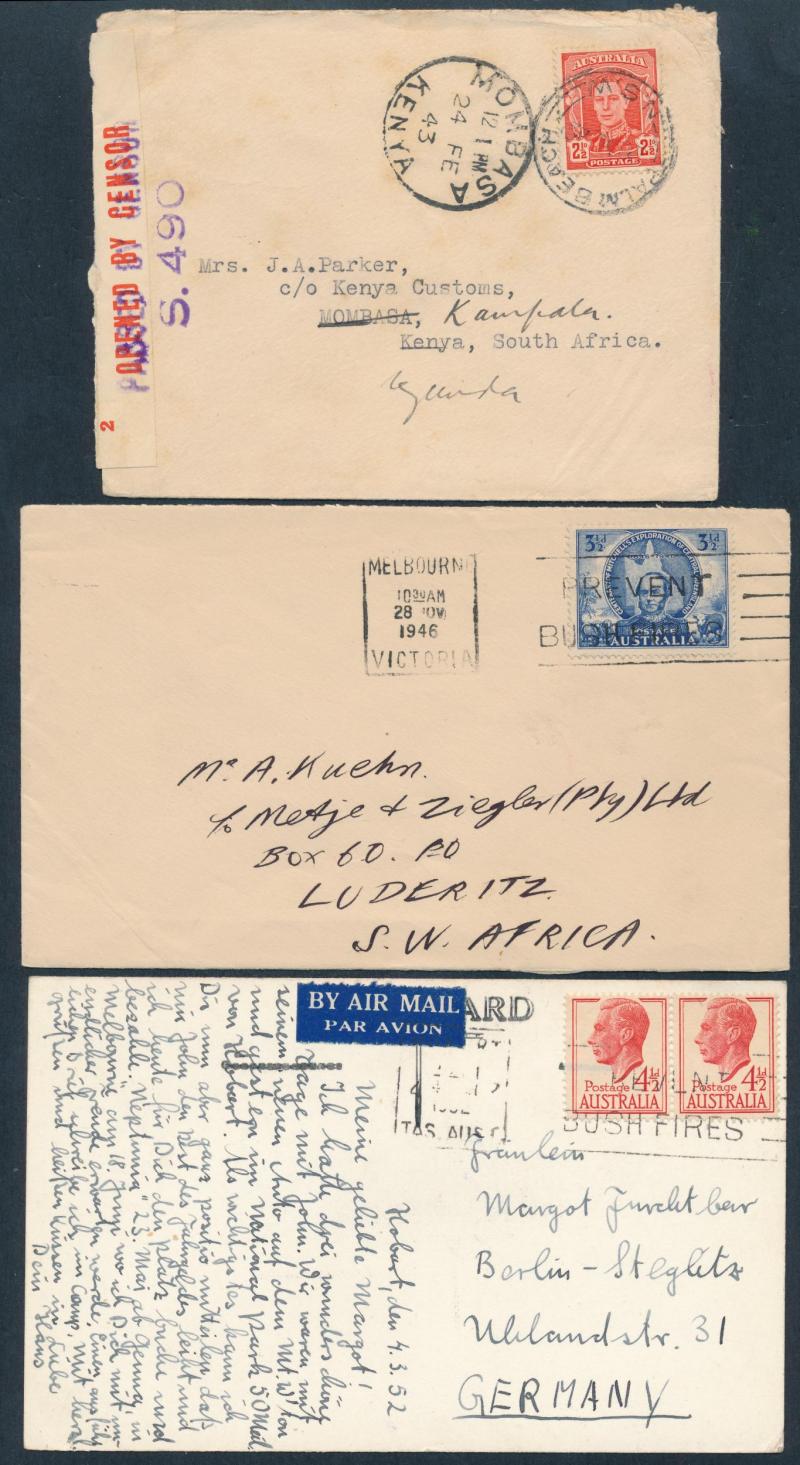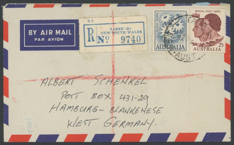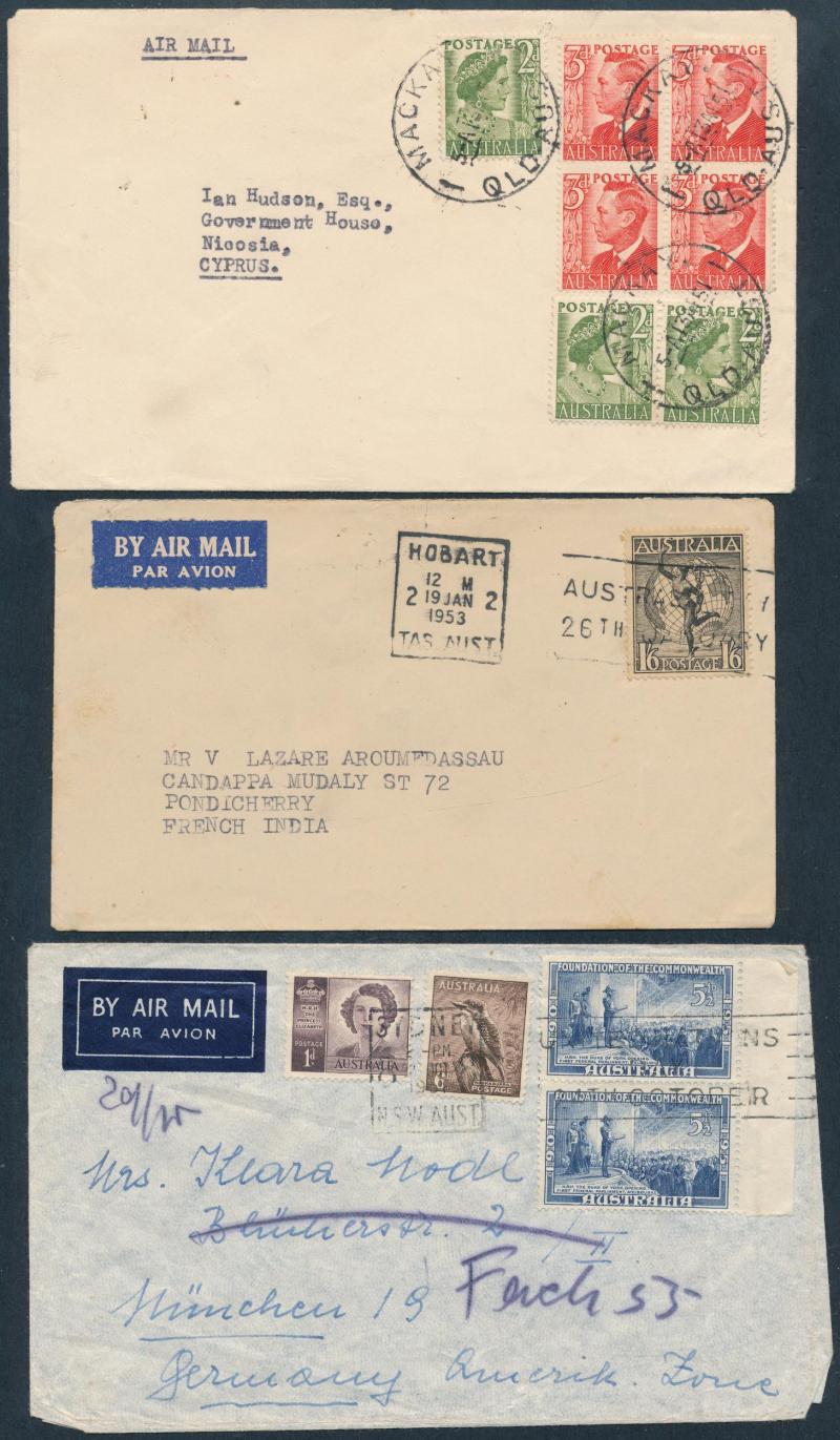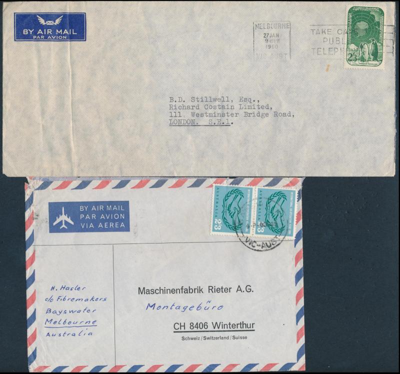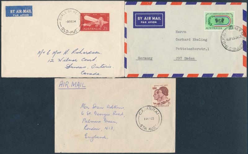 1747 c/long cover image1962-65 2/3d Commemoratives usages including Empire Games solos airmail to England, to Germany & to USA (overpaid), Royal Visit solo airmail to England and with 2/- Flower registered airmail to Germany, Cable solo to Germany and with 5d Christmas on domestic second weight-step registered, Airmail solos to England, to France on UNICEF envelope & to Canada (overpaid), ICY solo & pair both to England, pair to Switzerland plus with QEII 5d red domestic second weight-step registered, also AAT Penguin solos airmail to England, Germany & to Switzerland, the majority on standard-size envelopes, condition generally fine to very fine. (25) (Image1) (Image2) (Image3) (Image4) (Image5) (Image6) (Image7) (Image8) (Image9) (Image10) (Image11)