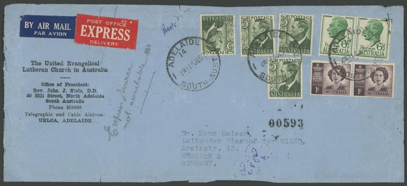 1738 long cover image1952 (June 14) Lutheran Church in Australia airmail cover to Germany with express labels and 2/3d in stamps tied by Adelaide cds, endorsed "Express Service/Not Available" and the label scored through, 'MUNCHEN/21.6.52' arrival backstamp, minor faults. The rate was 1/6d airmail letter plus 9d express delivery fee. (Image1) (Image2)