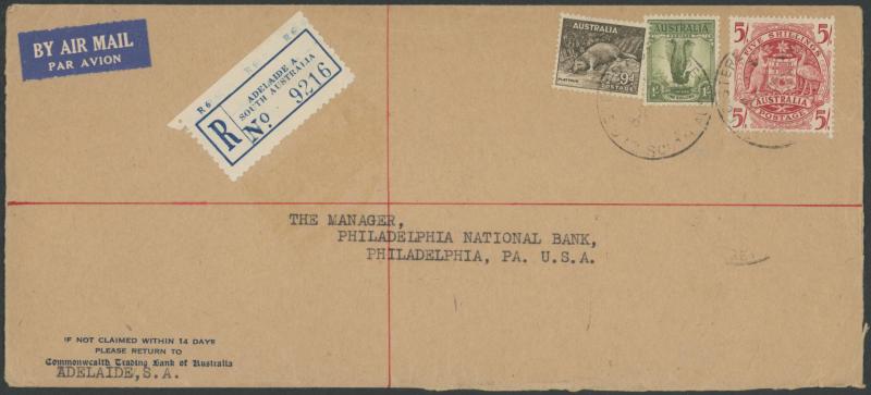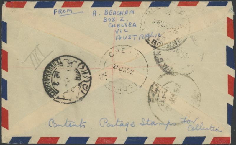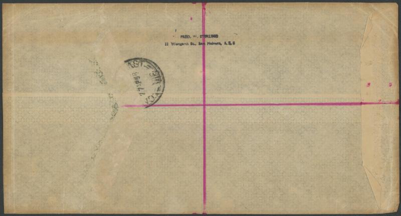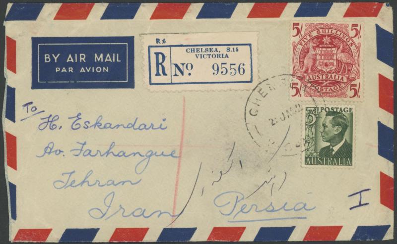 1742 c image1952 (Jan 25) airmail to Iran with Arms 5/- plus KGVI 3d green tied by 'CHELSEA/VIC-AUST' cds, blue/white registration label, rear with transits of Sydney and bilingual '.../6II52/No3/TEHERAN-ARRIKEE' arrival. The rate was triple 1/6d ½oz plus 9d registration fee. (Image1) (Image2)
