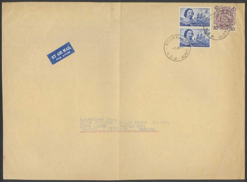 1749 long cover image1964 (Jan 3) Airmail cover (280x206mm) to Great Britain with scarce franking of Arms 10/- + Navigators 4/- Tasman tied by 'ROCKDALE/NSW-AUST', cover with vertical fold. The rate was octuple 2/3d ½oz for a total of 18/-. (Image1)