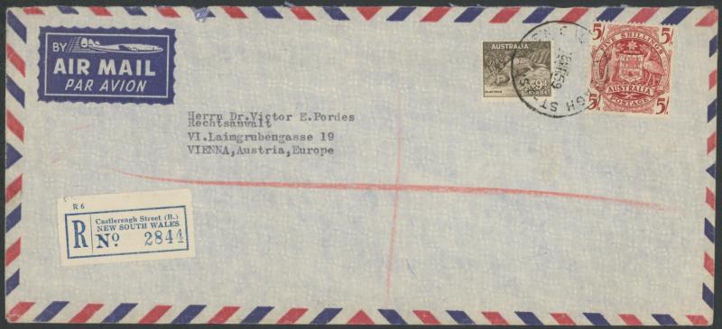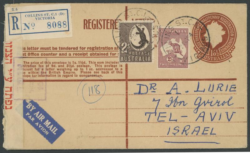 1744 PSE image1954 (May 24) usage of Registration Envelope QEII 1/0½d airmail to Israel with Kangaroos CofA Wmk 2/- maroon and 2/- Crocodile added tied by Melbourne 'COLLINS ST C.1' cds cancels and blue/white R label affixed, censored on arrival with Israeli Hebrew resealing label tied by boxed cachet in violet at left, minor opening faults & light transmission marks. The rate was double 2/- per ½oz airmail letter to the Middle East plus 9d registration fee (the 3½d domestic letter rate included in the imprinted value being ignored). (Image1)