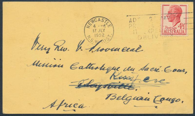 1739 c image1952 (Jul 17) JMJA (=Society of Jesus Mary Joseph Australia) postcard largely printed in Latin, to missionary in Belgian Congo/Africa with scarce franking of KGVI 4½ red (Cat $400 for solo franking) tied by Newcastle slogan, redirected on arrival. (Image1) (Image2)