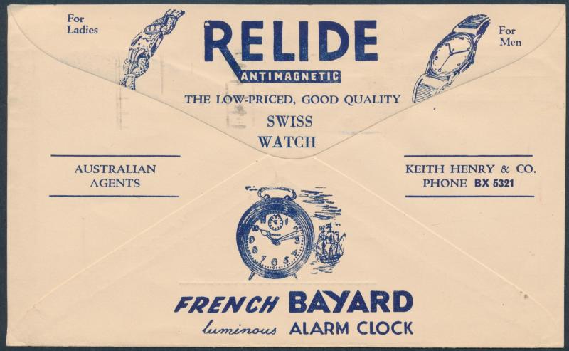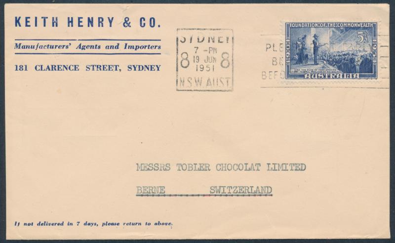 1735 c image1951 (Jun 19) advertising cover for Keith Henry & Co (Sydney) illustrated on reverse with watches, to Switzerland with scarce franking of Federation 5½d (Cat $300 for solo franking) tied by Sydney slogan, opened-out for display. (Image1) (Image2)