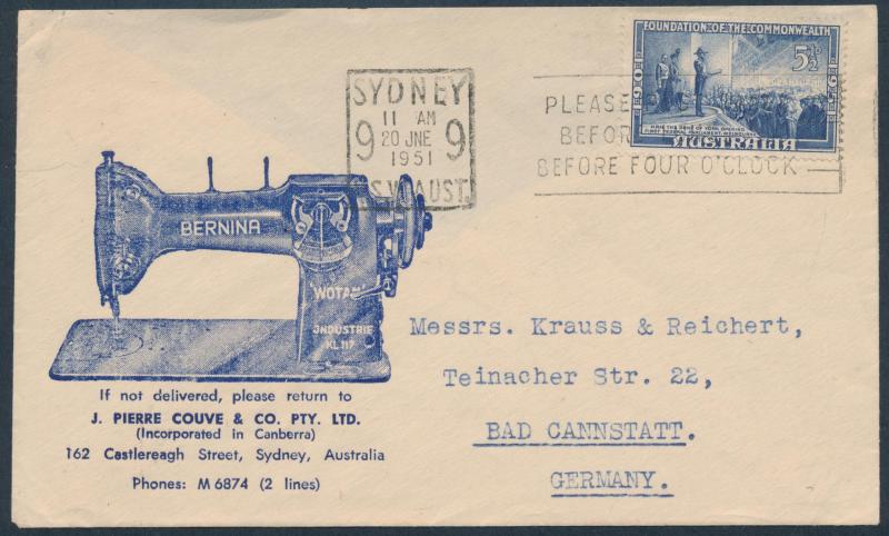1736 c image1951 (Jun 20) illustrated advertising cover for Bernina sewing machines to Germany with scarce franking of Federation 5½d (Cat $300 for solo franking) tied by Sydney slogan, flap removed. (Image1) (Image2)