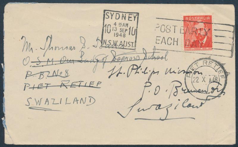 1733 c image1948 (Sep 13) social cover to a Catholic Mission School in Swaziland with Farrer 2½d tied by Sydney slogan, forwarded to Bremersdorp with very fine 'PET RETIEF' cds. (Image1) (Image2)