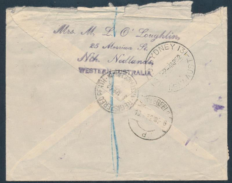 1737 c image1952 (Apr 3) registered express airmail cover to East Germany from Perth via Sydney with 'BITTERFELD/10.5.52/d' arrival b/s, opened a bit roughly. The rate was 1/6d airmail letter plus 6d registration plus 1/- express delivery fee. (Image1) (Image2)