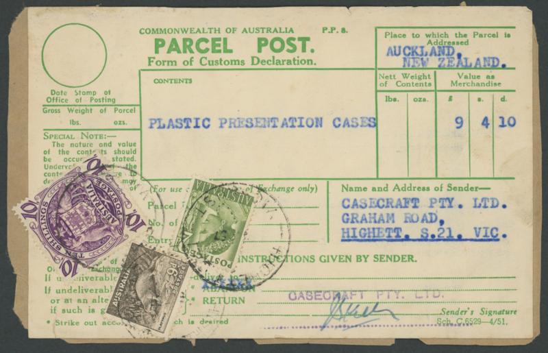 1745 c image1957 green/white 'PARCEL POST' Customs Declaration to New Zealand with 2d, 9d and Arms 10/- tied by 'HIGHETT S21/VIC-AUST' cds, contents declared as 'Plastic Presentation Cases' worth £9/4/10d. (Image1)