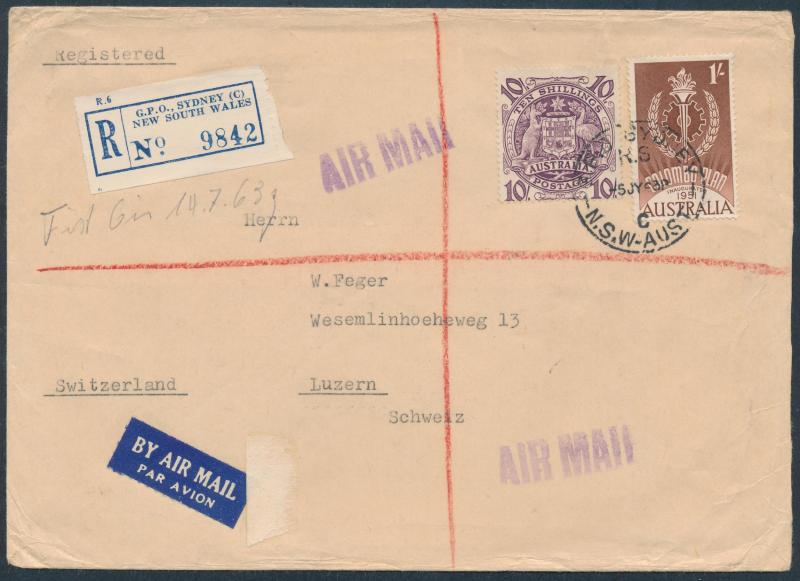 1748 c image1963 (Jul 5) airmail cover to Switzerland with 1/- Colombo Plan & 10/- Arms tied by Sydney cds, blue/white registration label, minor blemishes. Rate is quadruple 2/3d ½oz plus 2/- registration fee. (Image1) (Image2)