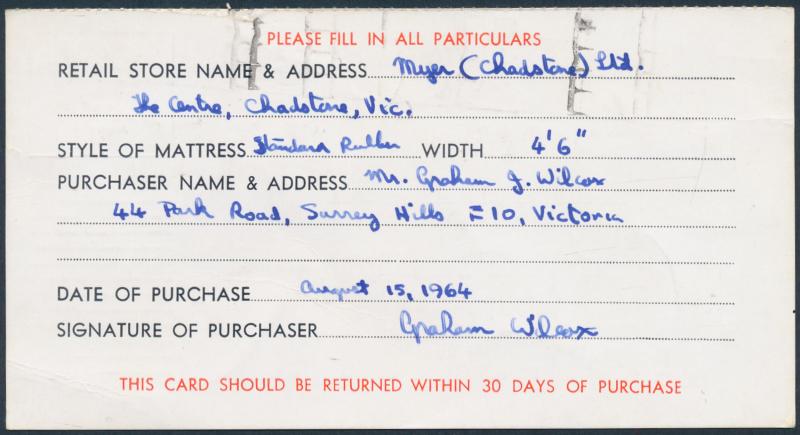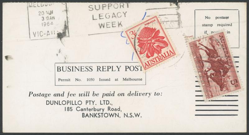 1750 image1964 (Aug 21) Dunlopillo business reply postcard returned with Melbourne machine cancel and Flowers 3/- Waratah & Cattle Industry 5/- White Paper (ACSC #373C; Cat $400 on cover) afffixed in lieu of Postage Dues tied Bankstown (NSW) cds paying postage on 18 similar articles at 6d each (5d postcard rate plus 1d reply mail fee), very fine. Scarce usage. (Image1) (Image2)
