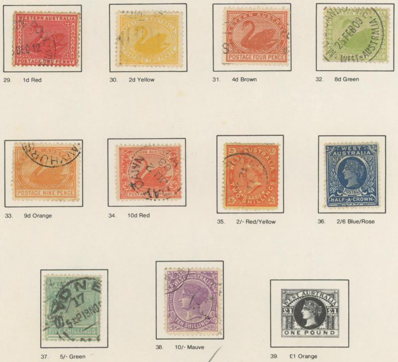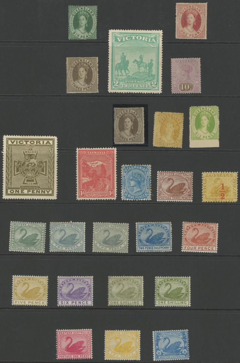 20/- CTO, plus Specimen 5/- Map & £1 overprinted 'OS', 1897 Charity (both *); Queensland 1900 Charity duo, Revenues to 20/- used; South Australia 'Postage & Revenue' to 5/- mint or used; Tasmania QV Tablets to 10/-; Victoria Half-Lengths to 3d, 1897