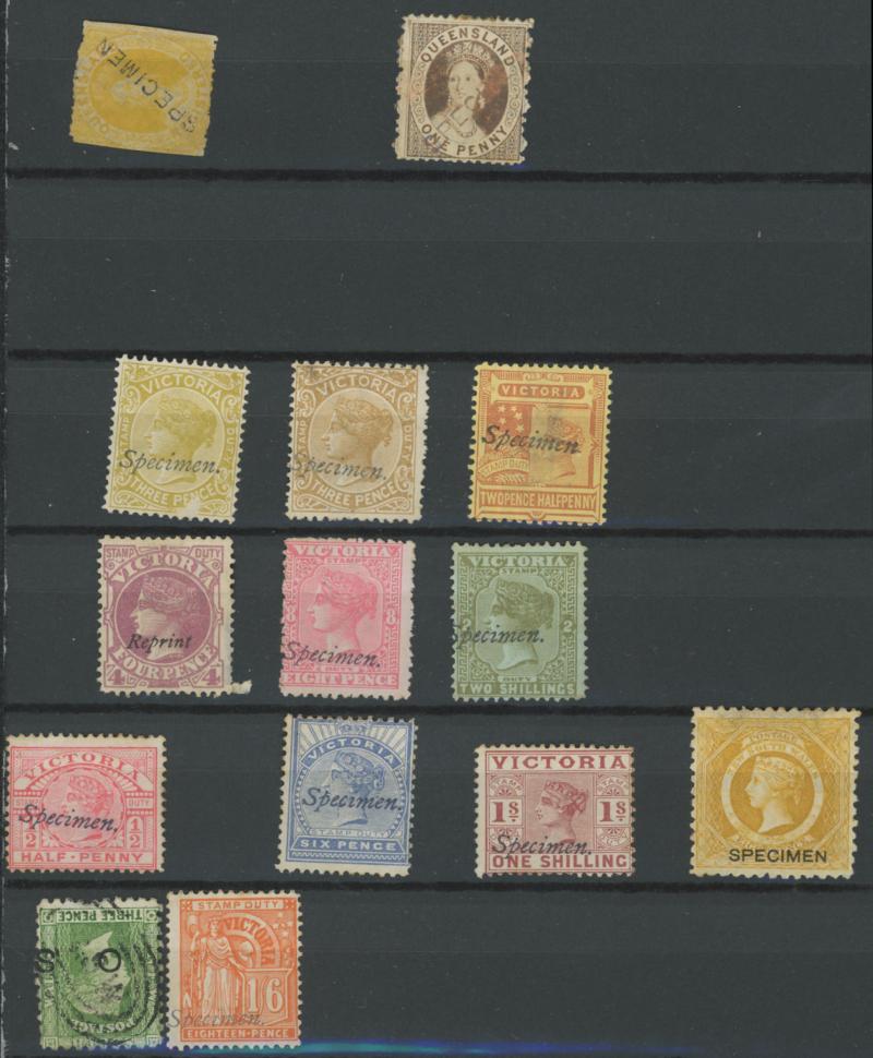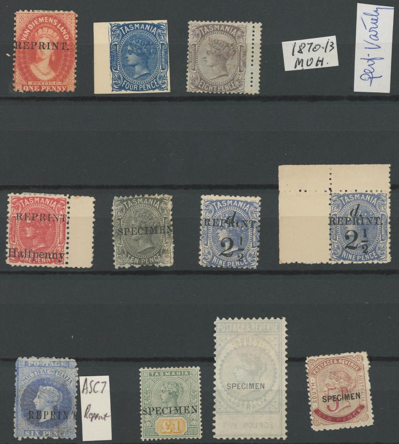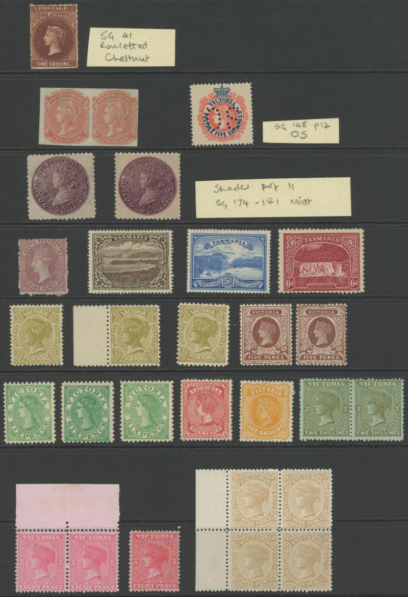 unused/mint Small Chalons 6d dark green SG 6 (Cat £1800), Rough Perfs 1d & 3d x2 and nine to 20/- with 'SPECIMEN' Overprint; Tasmania including Tablets 10/-; Victoria mint including Naish 'STAMP DUTY' 3d bistre block of 4 & 8d rosine pair (**), Boer