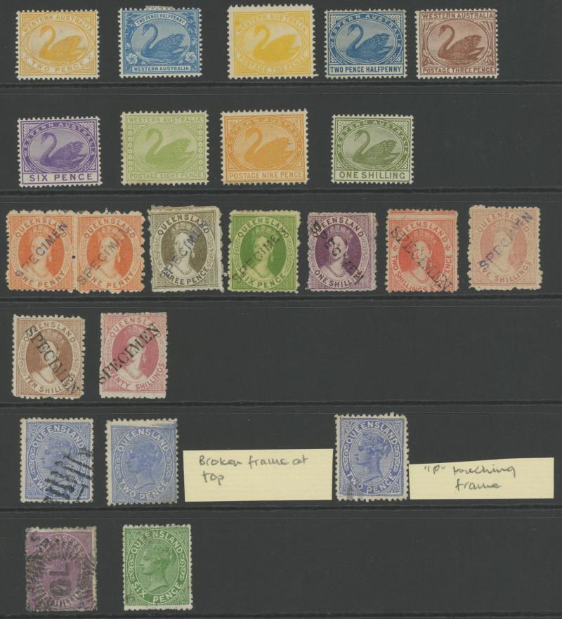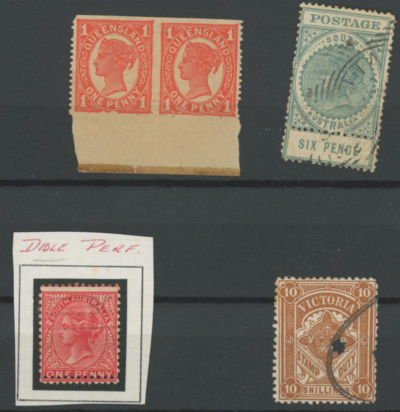 3d, Laureates with Numeral Wmk 1d & 2d strips of 5, Imperf 'REGISTERED' x3 (one a huge corner example); Queensland including Imperf 6d & an apparent 2d SG 2 but it has blind misplaced perfs through the design; South Australia London Printings 1d on