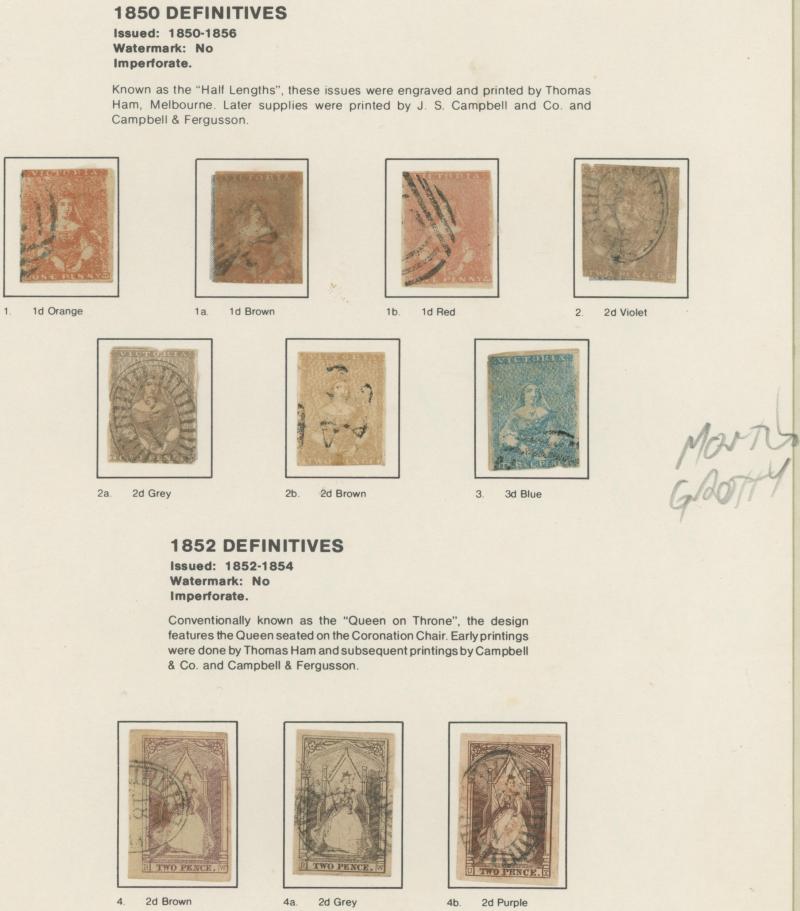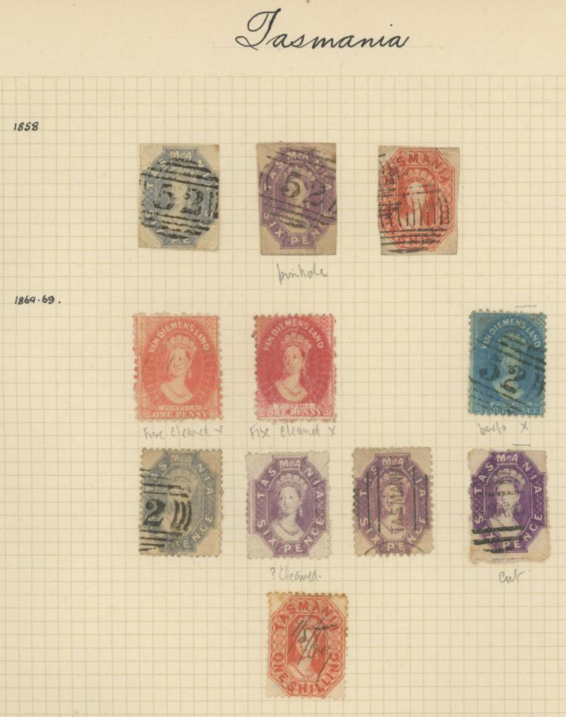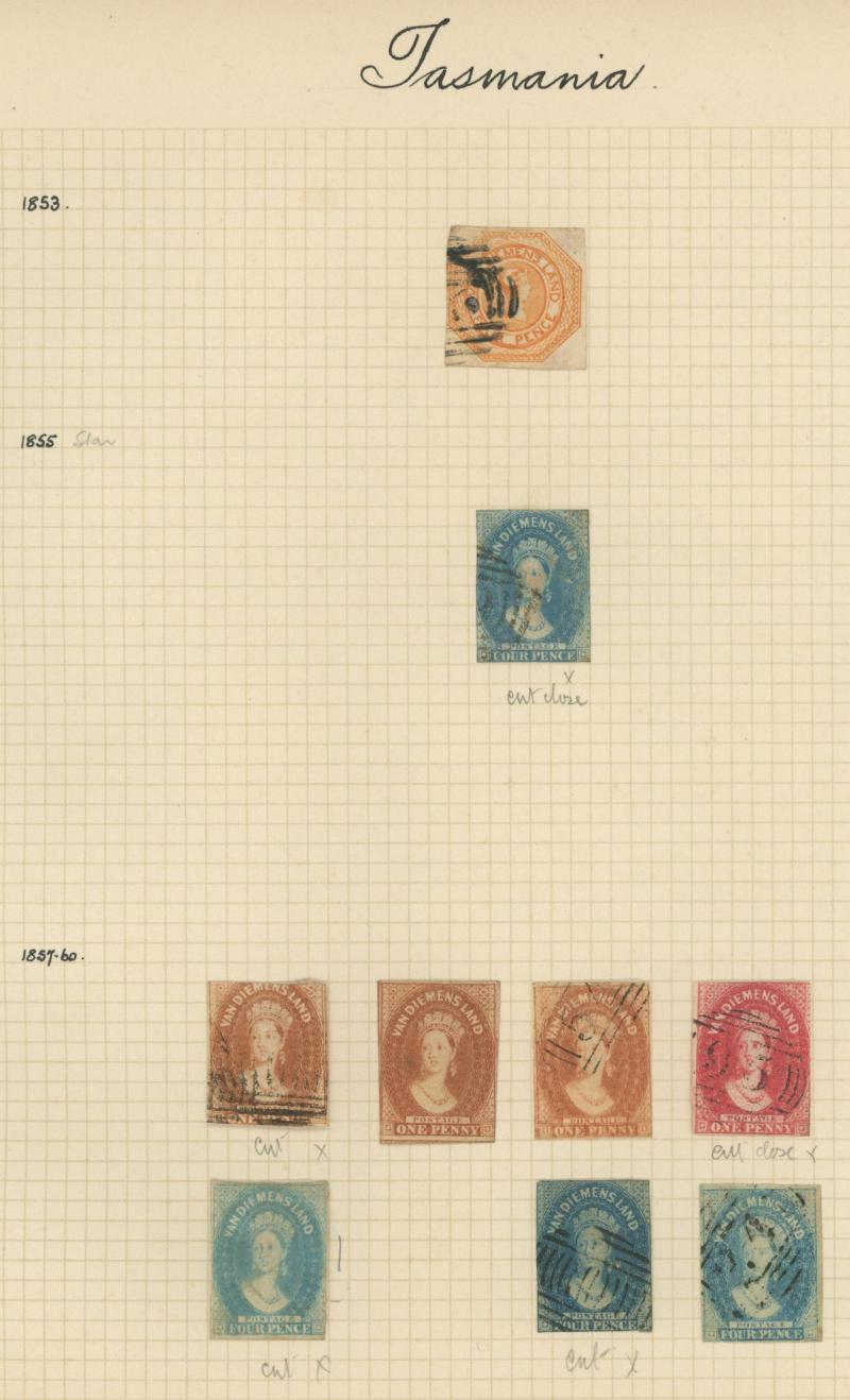 on 1858 envelope to England, several proofs & posthumous reprinted proofs, Thin 'POSTAGE' 3d with Misplaced Tablets and 1/- Bicolour, eight Departmentals including 'G.P.' in Blue on 2/-; and Tasmania some attractive apparently postally used Chalons;
