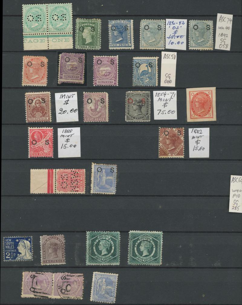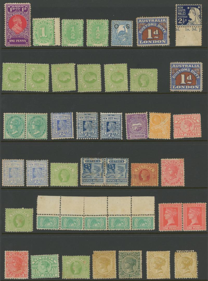 brown punctured 'OS/NSW' used, other Officials overprinted/punctured 'OS', Victoria 1897 QV Jubilee Charity duo * x2 plus 1d pair used, 1900 Boer War Charity duo * x2, NSW & Victoria Postage Dues, then a substantial quantity of used on pages with