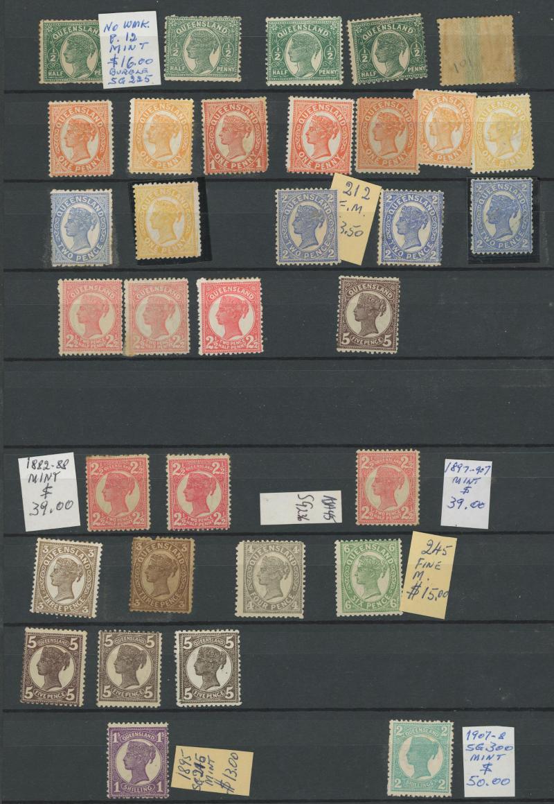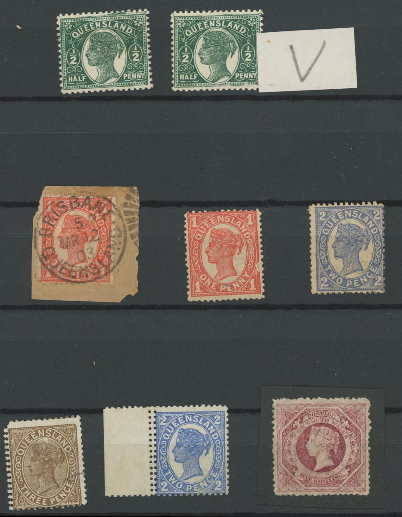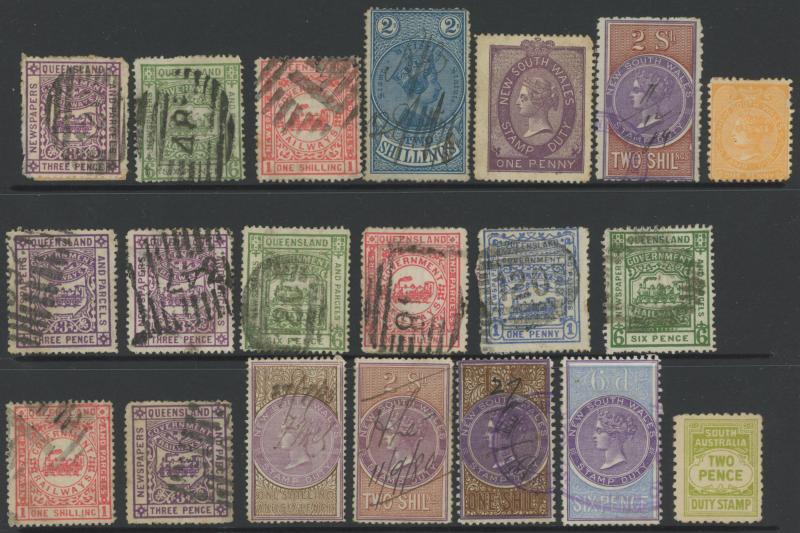 REVENUES: NSW Telegraphs 1d unused; Quensland Impressed Duty QV £300 & £500 both CTO with black cds, Railways ½d mint (very scarce)