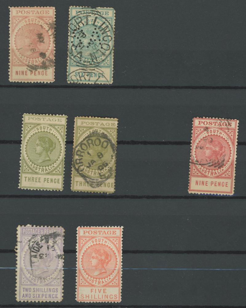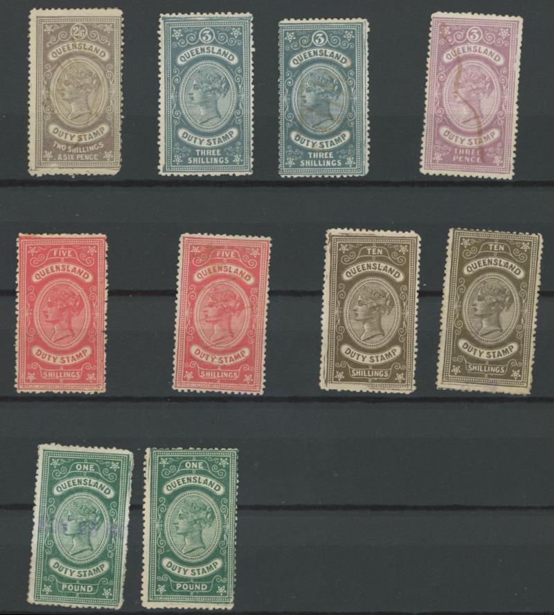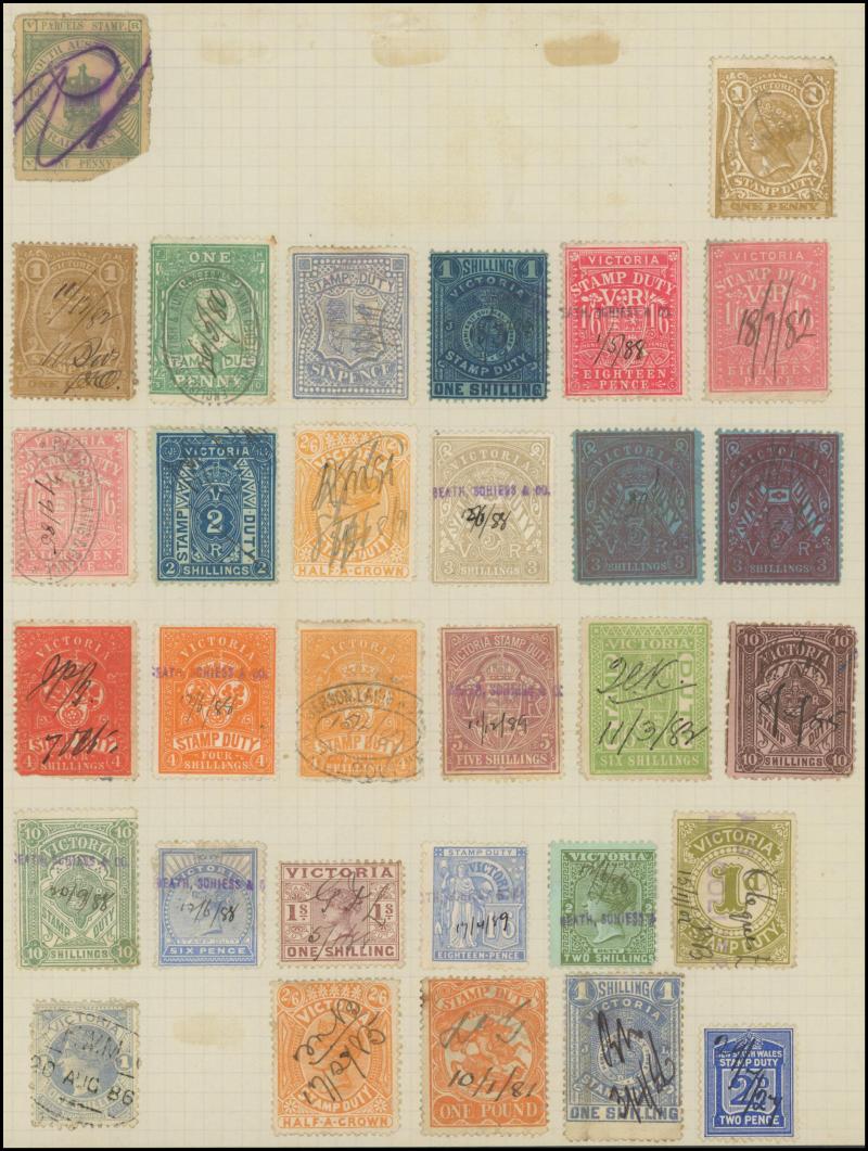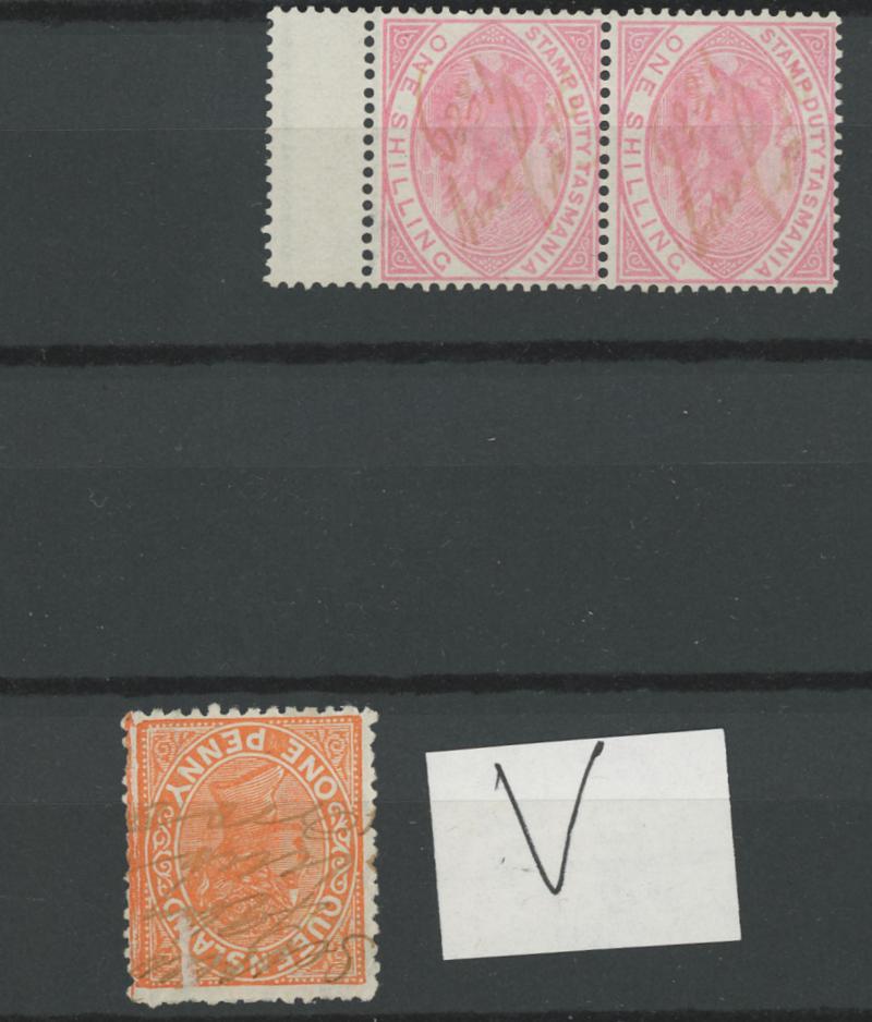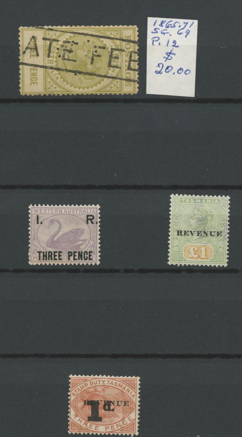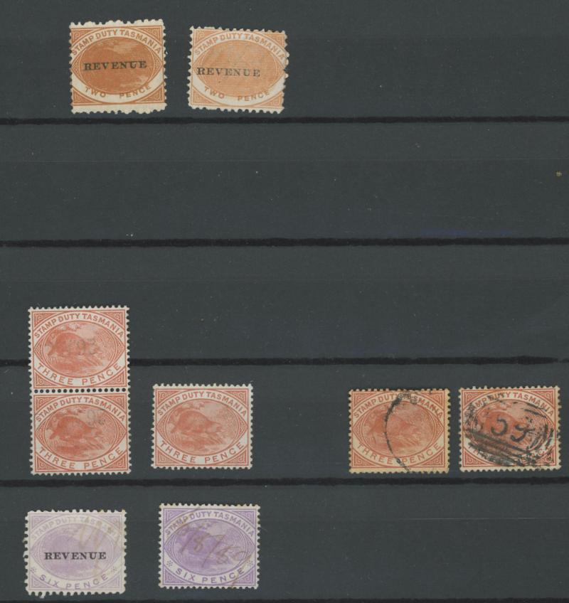 Australia 1902-12 'Postage & Revenue' £5; Tasmania 1892-1913 Tablet £1, plus Reprints; Victoria values to 1/6d; also Queensland QV Duty stamps to £1, Stamp Duty to £30; and double-perforated Qld 2d and SA 6d 'Postage & Revenue'; overall condition