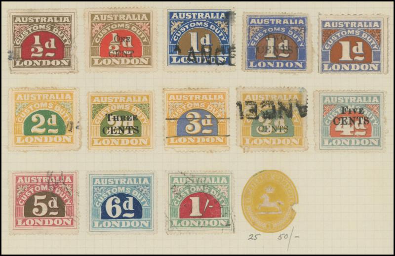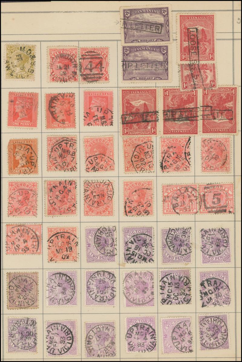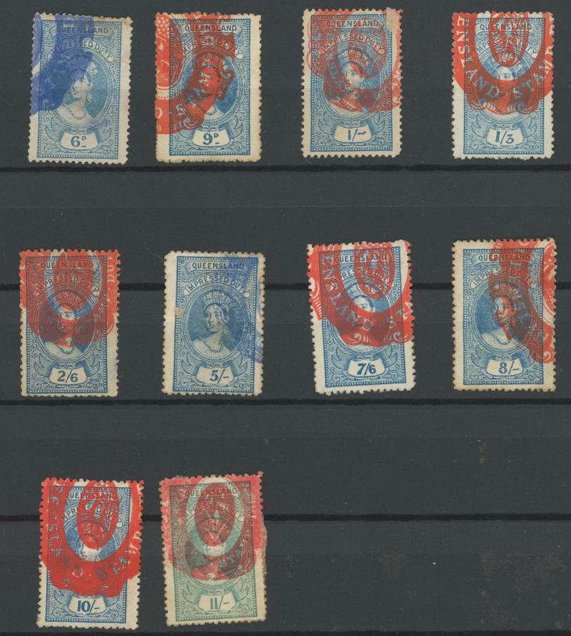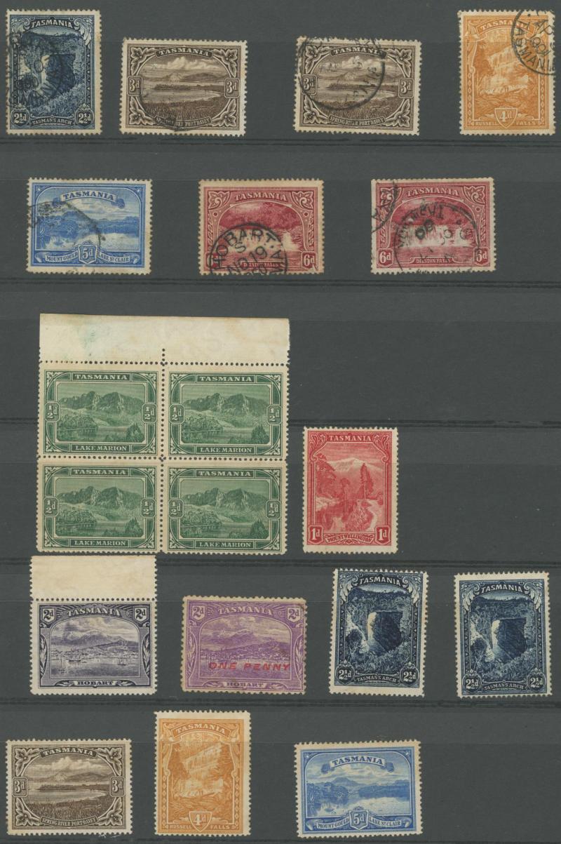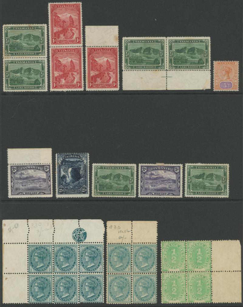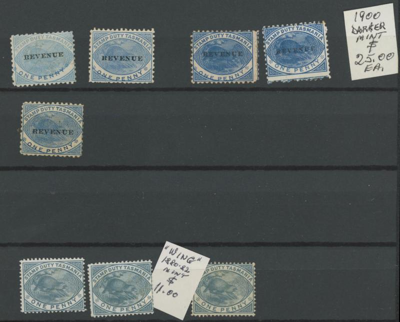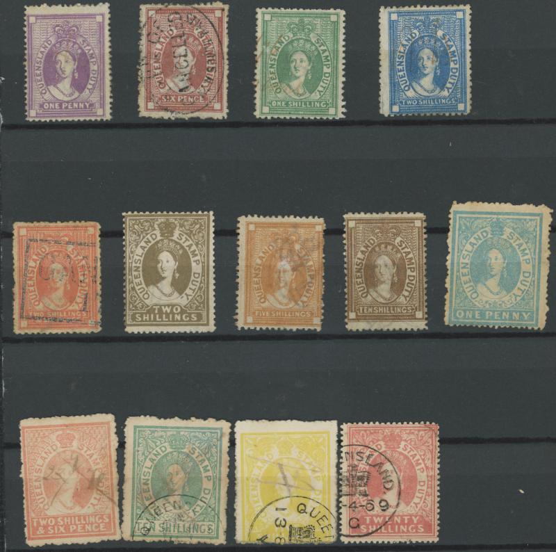 Australia 1902-12 'Postage & Revenue' £5; Tasmania 1892-1913 Tablet £1, plus Reprints; Victoria values to 1/6d; also Queensland QV Duty stamps to £1, Stamp Duty to £30; and double-perforated Qld 2d and SA 6d 'Postage & Revenue'; overall condition