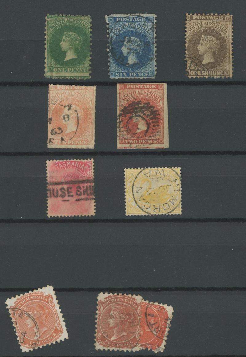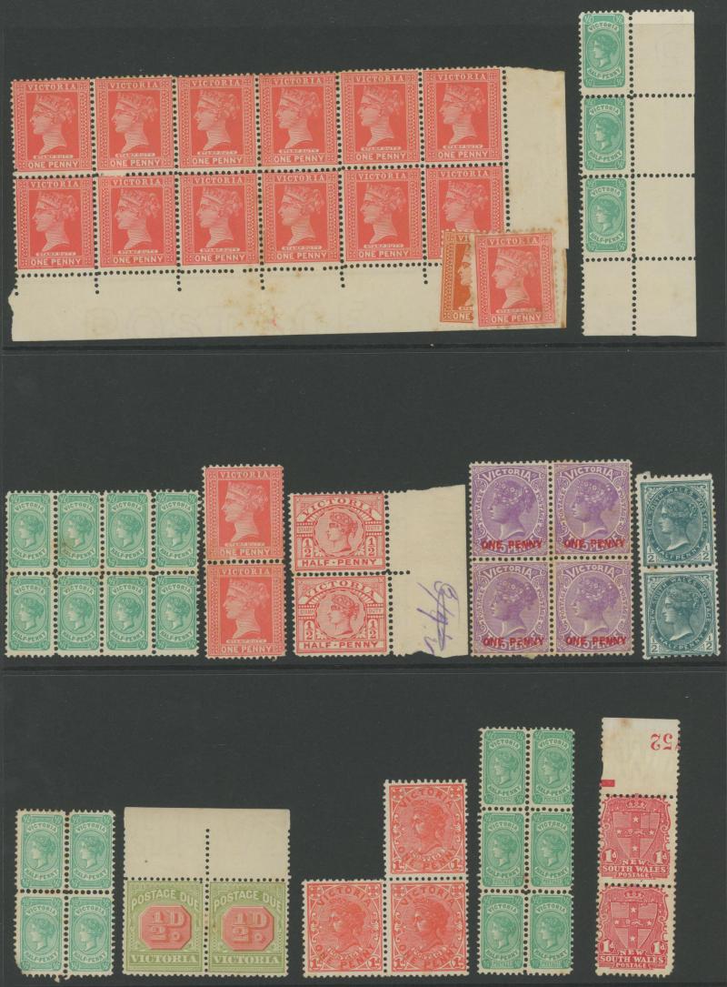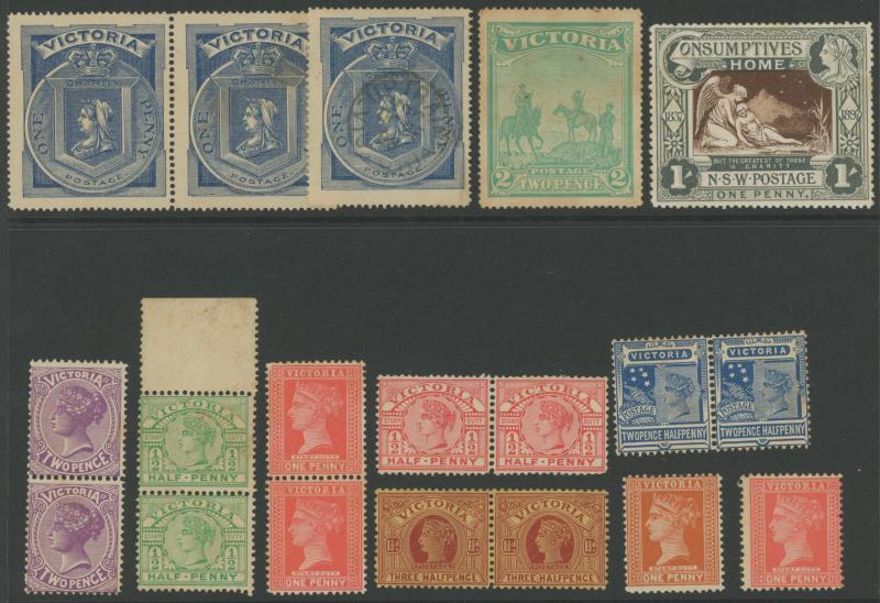 small piece, 2d pair & 6d x2 and Adelaide Printings 2d blood-red pair & 1/- orange; Tasmania including Couriers 1d & 4d, Chalons Star Wmk 1d 2d & 4d pair; Victoria including Ham Half-Lengths 2d x2 & 3d, Woodblocks Imperf 2/- 'TOO LATE' &
