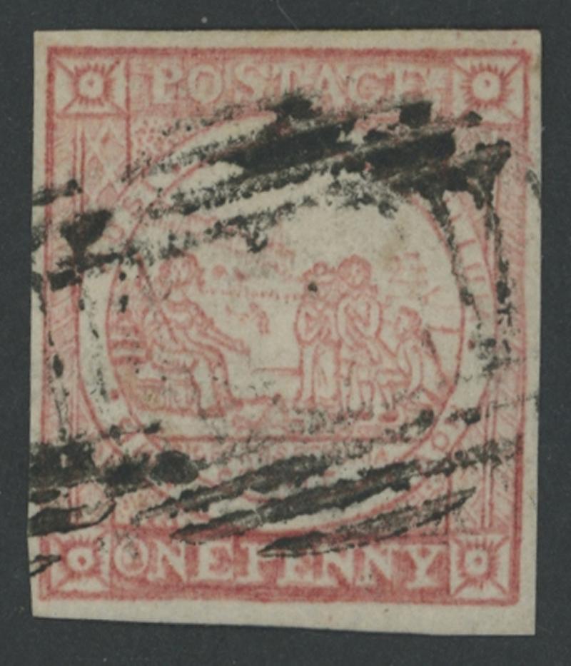 1850-51 Sydney Views 1d pale red Plate I (No Clouds) Hard Bluish Paper SG 5, margins good to large, indistinct numeral cancel