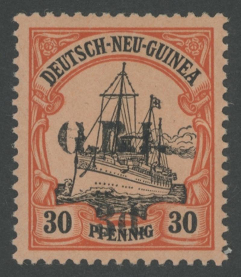 1914-15 5mm Spacing on German New Guinea '3d.' on 30pf black & orange/buff SG 23 (Michel 8II; Scott 23) [Setting 4 Pos 7],