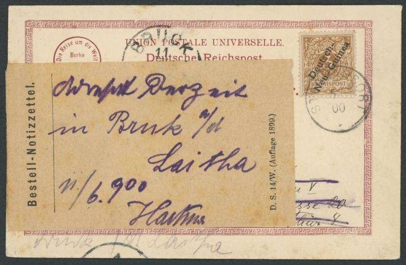 'Deutsch/Neu-Guinea' Overprints 3pf brown tied by a largely very fine 'STEPHANSORT/5 5/00' cds, on arrival redirected with 'Bestell-Notitzzettel' label with the new address affixed and 'BRUCK/11/6/00/A. D. LEITHA' cds arrival, a few minor aging