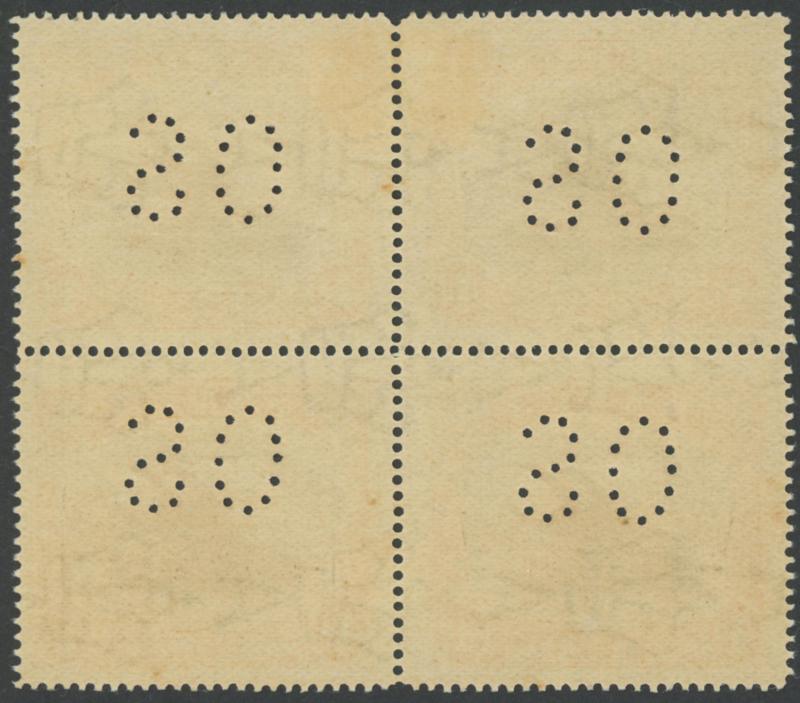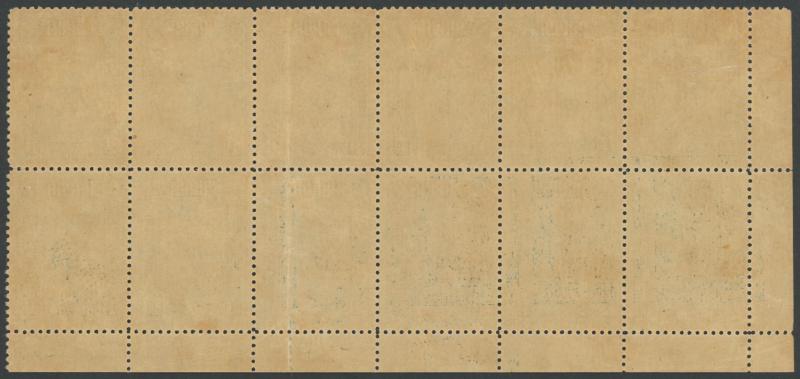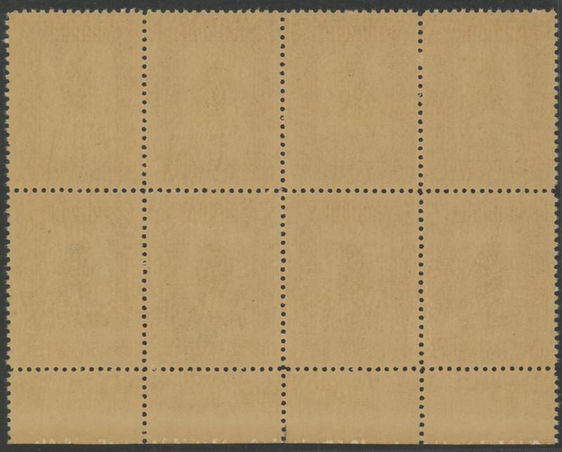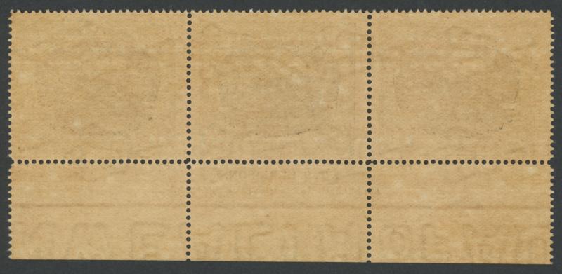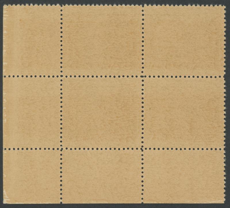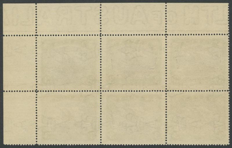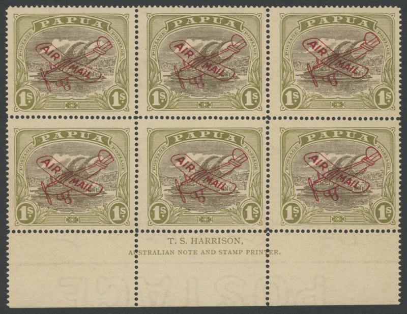 2157 nh image1930 Lakatoi Aeroplane Overprints Harrison Printings 1/- sepia & deep olive as SG 117 but with the Overprint in Deep Carmine TS Harrison Imprint block of 6 (3x2) from the base of the sheet, characteristic minor gum tropicalisation, unmounted. Unlisted in Gibbons. Rev Roger Lee's imprint block of 6 - one upper unit mounted - sold at our auction of 29.6.2023 for $900 (Sale 252 Lot 1310). (Image1) (Image2)