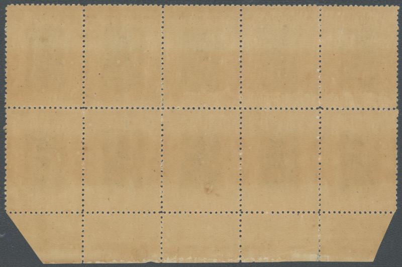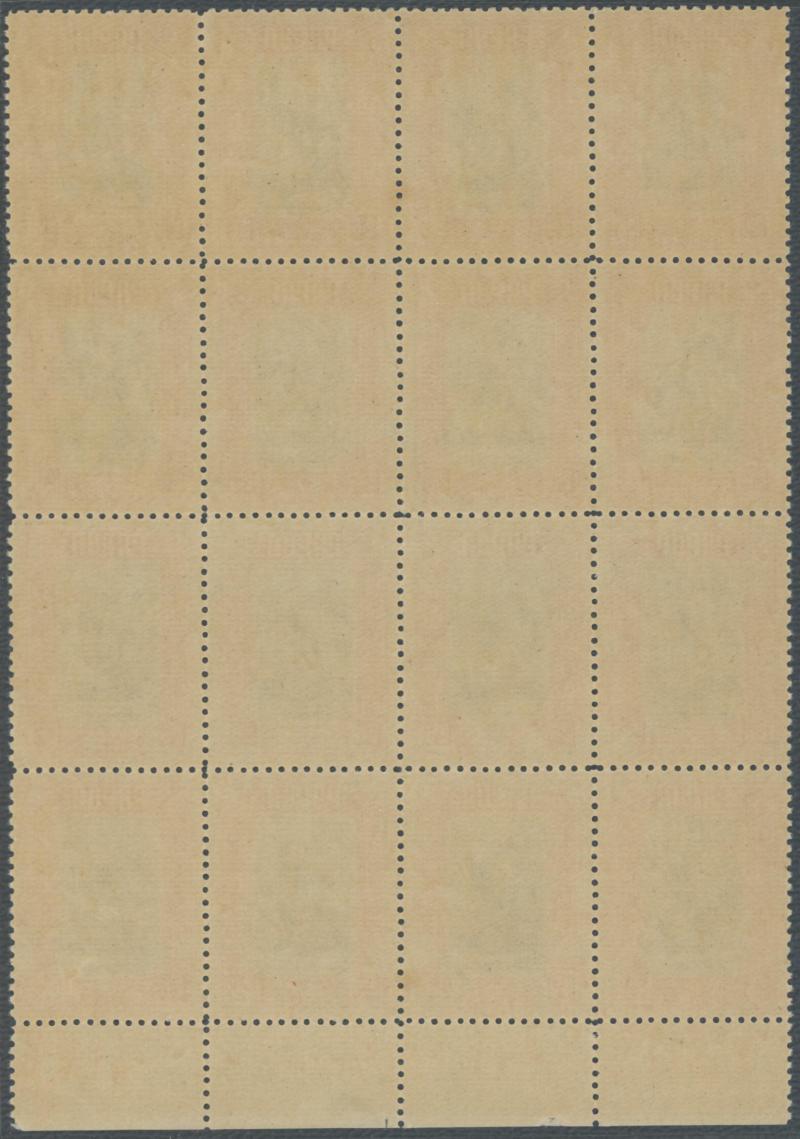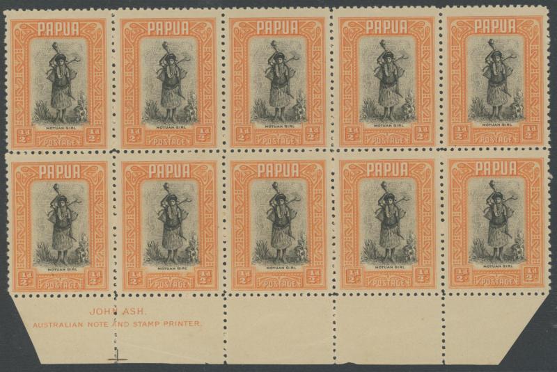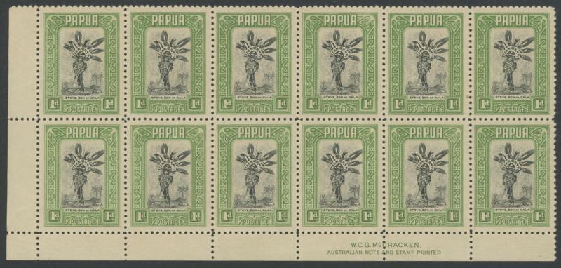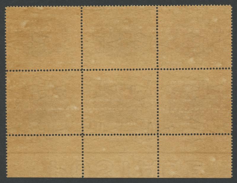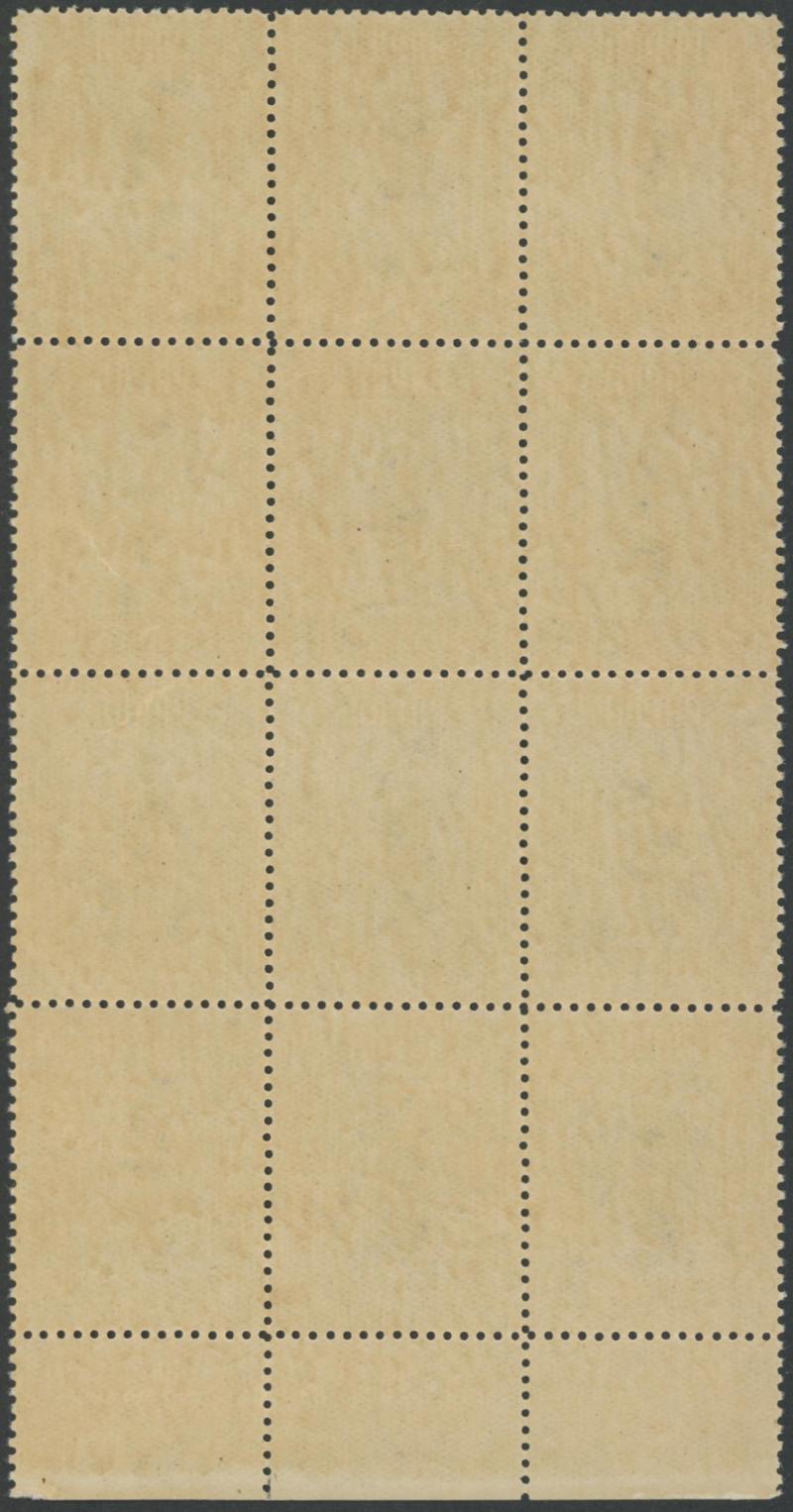 2157 nh image1930 Lakatoi Aeroplane Overprints Harrison Printings 1/- sepia & deep olive as SG 117 but with the Overprint in Deep Carmine TS Harrison Imprint block of 6 (3x2) from the base of the sheet, characteristic minor gum tropicalisation, unmounted. Unlisted in Gibbons. Rev Roger Lee's imprint block of 6 - one upper unit mounted - sold at our auction of 29.6.2023 for $900 (Sale 252 Lot 1310). (Image1) (Image2)
