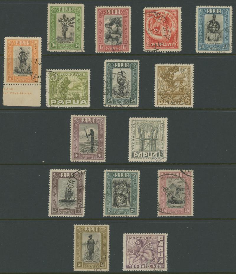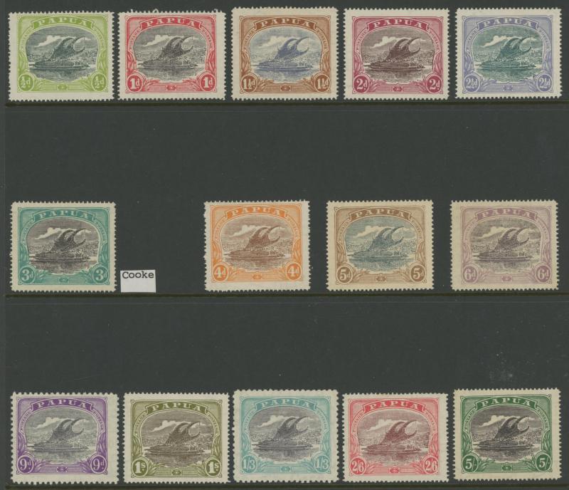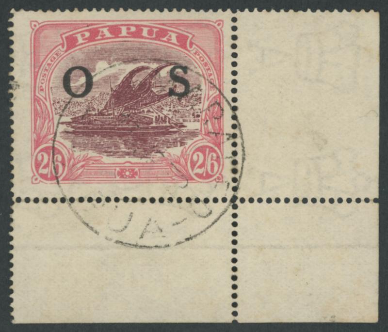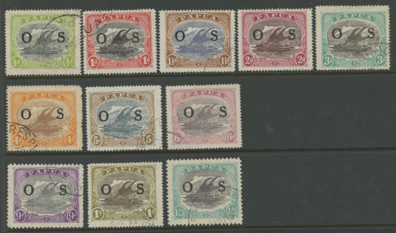 2165 F imageOFFICIAL STAMPS: 1916-31 Lakatoi Bicolours 'OS' Overprints ½d to 2/6d set SG O55-O66, the 2/6d a marginal example from the lower-right corner of the the sheet with complete Samarai 1932 cds, the others all with neat or light cds cancels (a couple not identifiable), Cat £350. (12) (Image1) (Image2)
