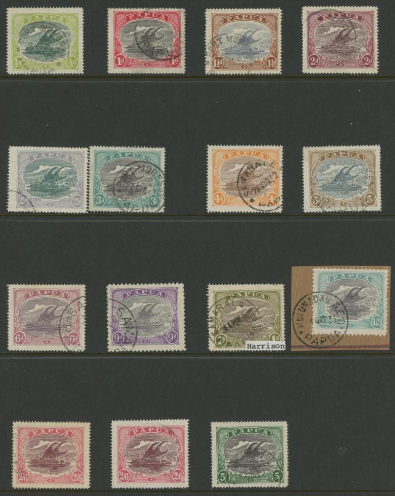 2152 F image1916-31 Lakatoi Bicolours ½d to 10/- set including both shades of the 2/6d SG 93-105 plus 1932 9d & 1/3d (on piece), mostly well-centred, all with neat cds cancels but the 10/- has a modern PNG cds, Cat £495. (16) (Image1) (Image2)