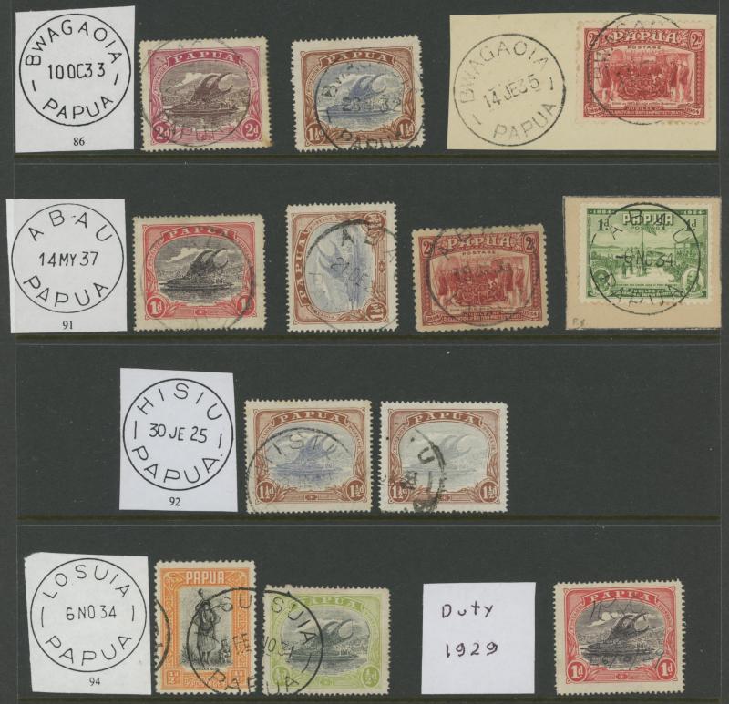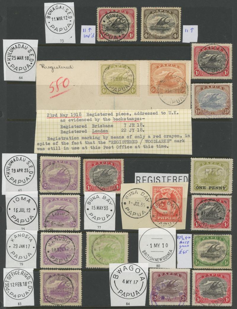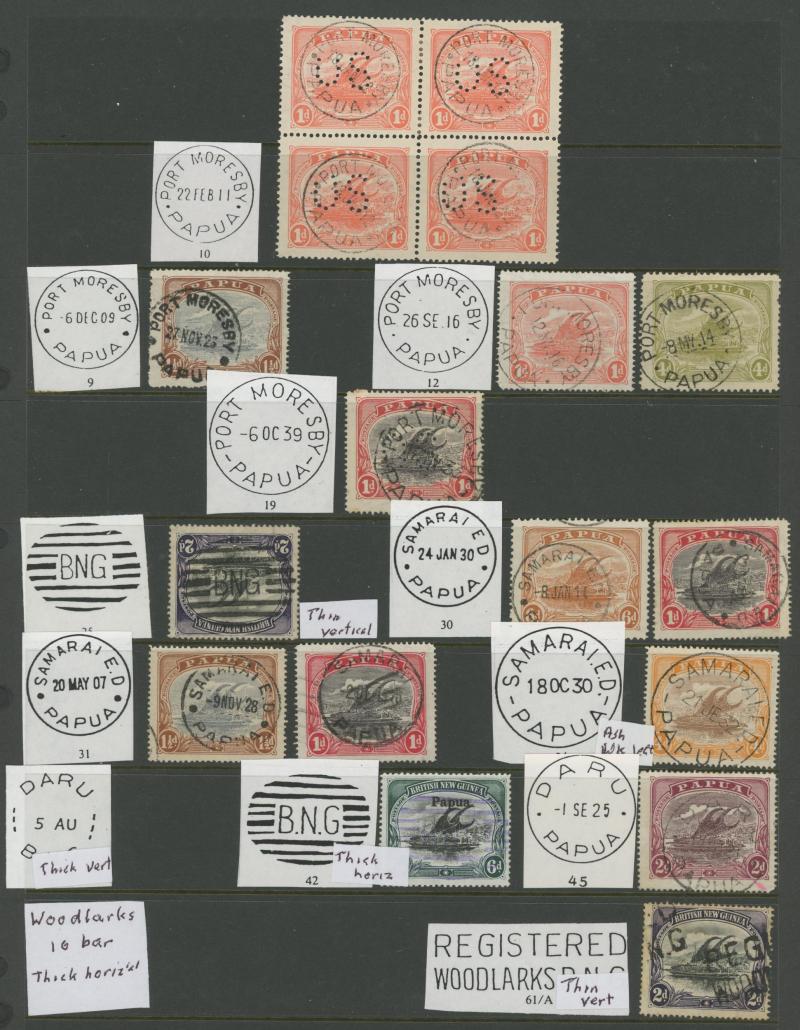 2168 S= imagePOSTMARKS: Selection including 'BNG'-in-bars cancels x3 (two in violet; one stated to be of Woodlarks on BNG 1/-), complete 'DARU' unframed on BNG 6d, partial 'REGI[STERED]/WOODL[ARKS]' on BNG 2d, also Abau, Bwagaoia, Hisiu, etc, large-part 'S.S. Morinda' ship cancel on Small 'PAPUA' 2d x2, stamps stated to Cat £370+. (50 stamps) (Image1) (Image2) (Image3) (Image4)