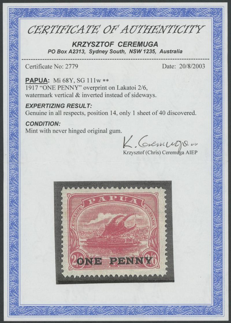 2154 nh image1917 Monocolours 'ONE PENNY' Surcharges Crown/A Watermark Upright Inverted 2/6d rose-carmine SG 111a, well-centred, a couple of very minor blemishes on the gum, unmounted, Cat £2500. Chris Ceremuga Certificate (2003) states "position 14, only 1 sheet of 40 discovered ... never hinged original gum". A similar example sold at our auction of 24.6.2025 for $1405 (Sale 260 Lot 2157). (Image1) (Image2) (Image3) (Image4)