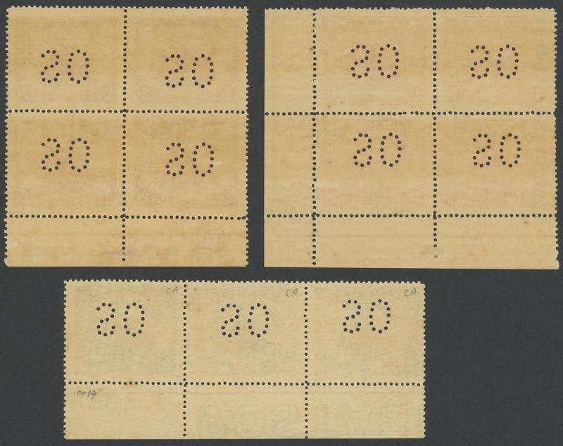 2163 nh imageOFFICIAL STAMPS: 1911-12 Monocolours Punctured 'OS' 1d rose-pink & 2d bright mauve SG O39-O40 blocks of 4 with 'CA' Monograms in the lower margins plus 2½d bright ultramarine horizontal strip of 3 with 'CA' & 'JBC' Monograms in the lower margin, a few minor aging marks on the reverse of some units, lightly mounted or with small hinge remainders in the margins only, the stamps unmounted, Cat £439+ for non-monogram mounted singles. (2 blocks + strip) (Image1) (Image2)