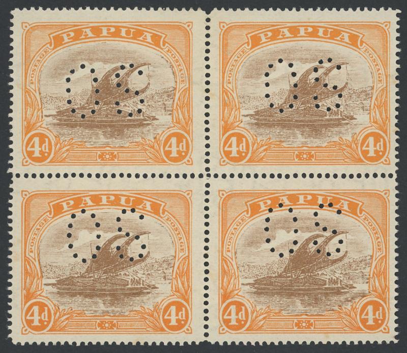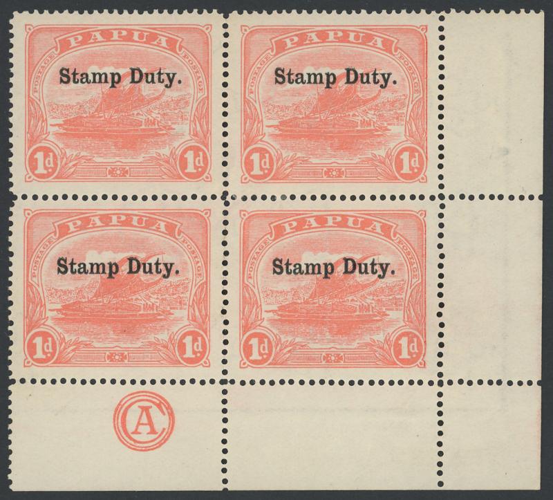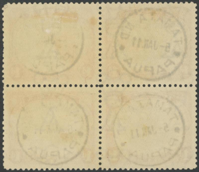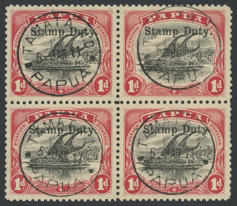2166 F imageSTAMP DUTY OVERPRINTS: 1910 'Stamp Duty.' on Large 'PAPUA' 1d black & carmine-red block of 4, exceptionally well-centred, four largely very fine strikes of 'TAMATA/5-JAN.11/PAPUA' cds cancels used at Ioma, unlisted by Gibbons who list only the Monocolours 1d rose-pink used at Samarai but state "other values ... are known used at other offices and at other times, but such use was not authorised". (Image1) (Image2)