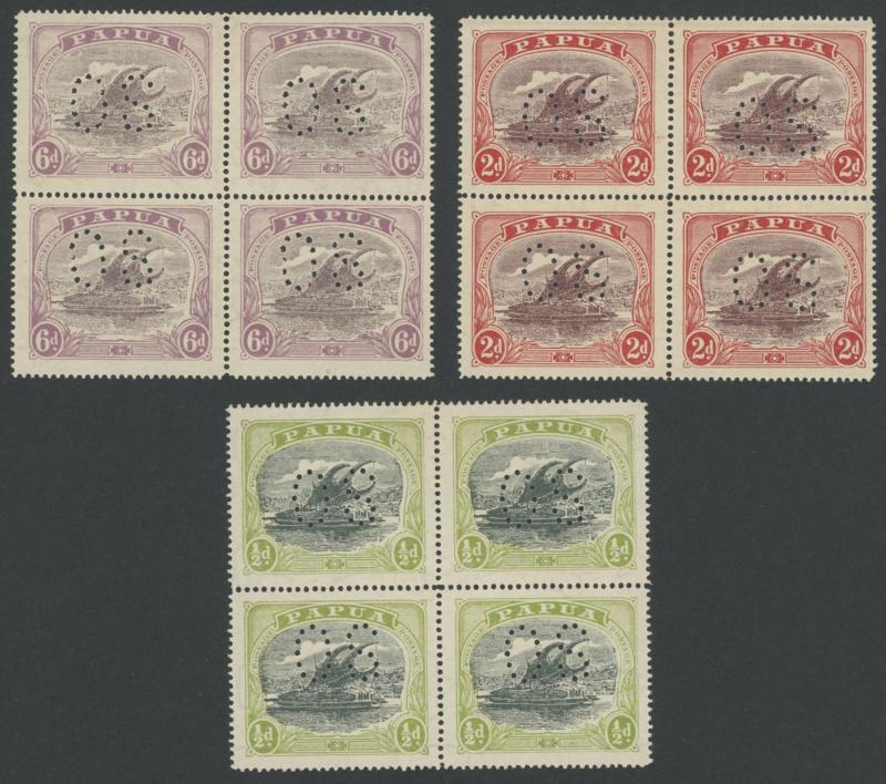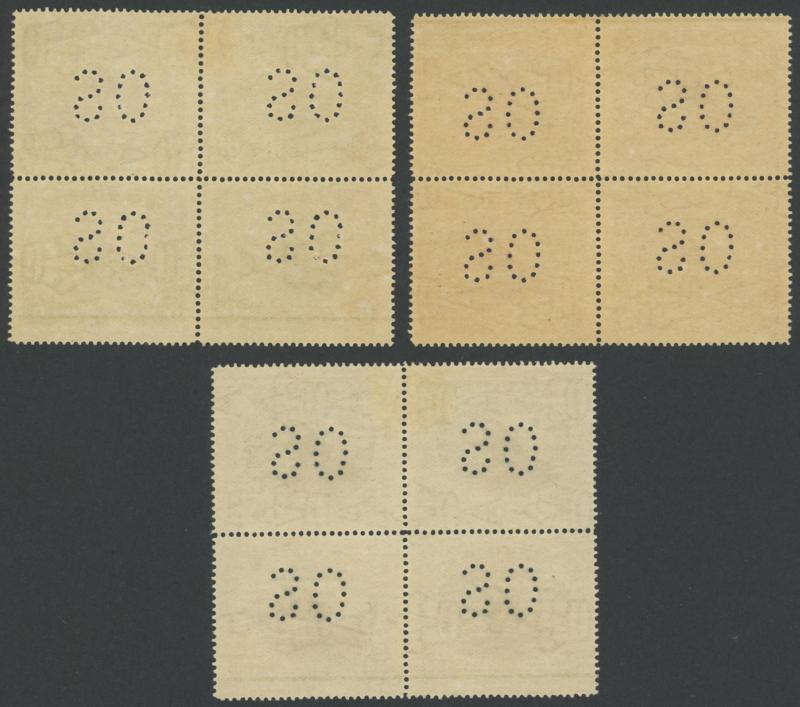 2164 og/nh imageOFFICIAL STAMPS: 1930 Bicolours Punctured 'OS' ½d, 2d, 4d & 6d SG O46, O49, O50 & O51 blocks of 4, the upper units with small hinge remainders, the lower units unmounted, Cat £736+ for mounted singles. (4 blocks) (Image1) (Image2) (Image3) (Image4)