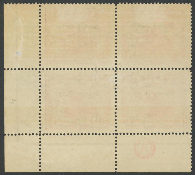 2167 og imageSTAMP DUTY OVERPRINTS: 1911 'Stamp Duty.' on Monocolours 1d rose-pink SG F1 block of 4 with 'CA' Monogram in the lower margin, exceptionally well-centred, lightly mounted or with tiny hinge remainders, Cat £260+ for non-monogram singles. (Image1) (Image2)