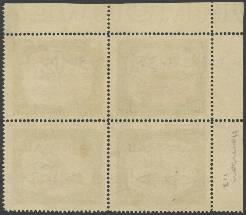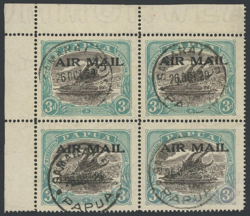 2155 F image1929-30 'AIR MAIL' Overprints Harrison Printings 3d sepia-black & bright blue-green SG 113 marginal block of 4 from the upper-left corner of the sheet, well-centred, four light strikes of Samarai 1929 cds cancels, Cat £300+ for singles. (Image1) (Image2)