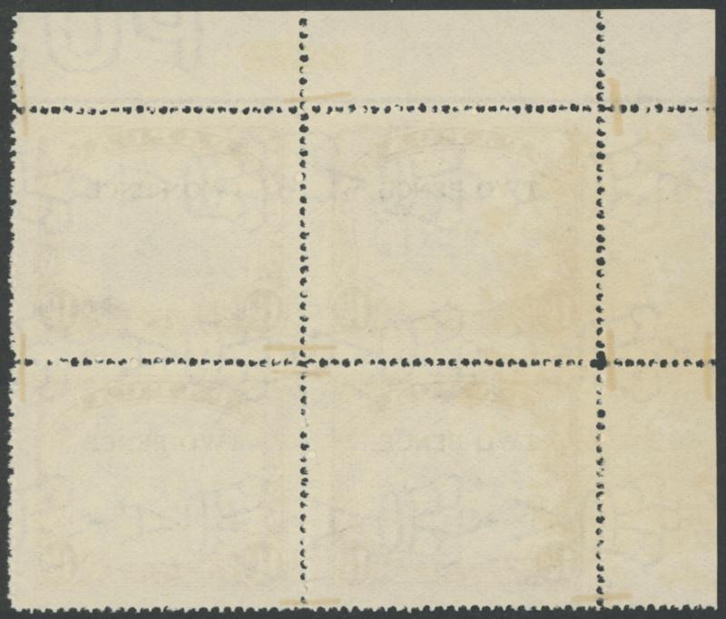 2158 F image1931 Surcharges on Bicolours Mullett Printings 'TWO PENCE' on 1½d cobalt & light brown SG 121 block of 4 from the upper-left corner of the sheet with 'POSTACE' at Right [Pos 1] SG 121a & Rift in Clouds [Pos 2], quite well-centred, two light strikes of Samarai 1931 cds cancels, Cat £315+ for singles. (Image1) (Image2)