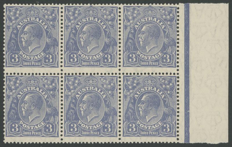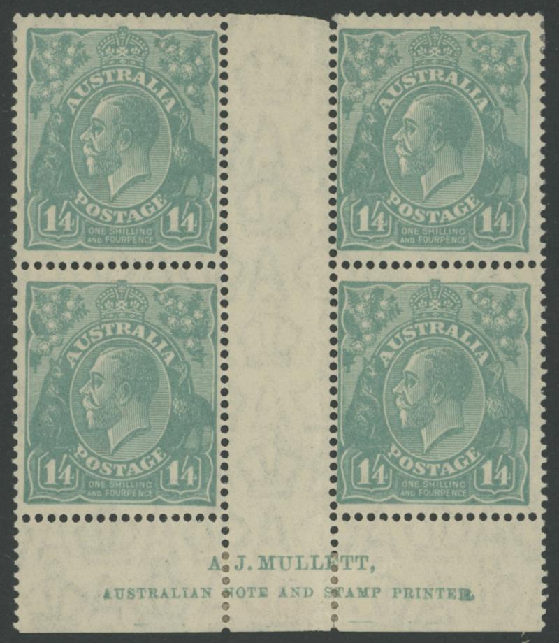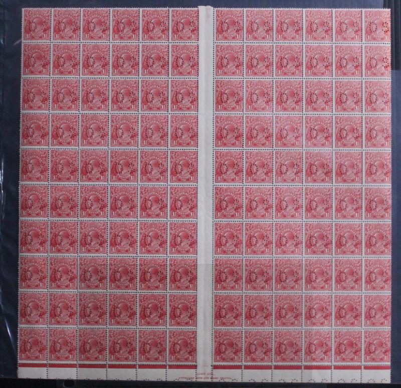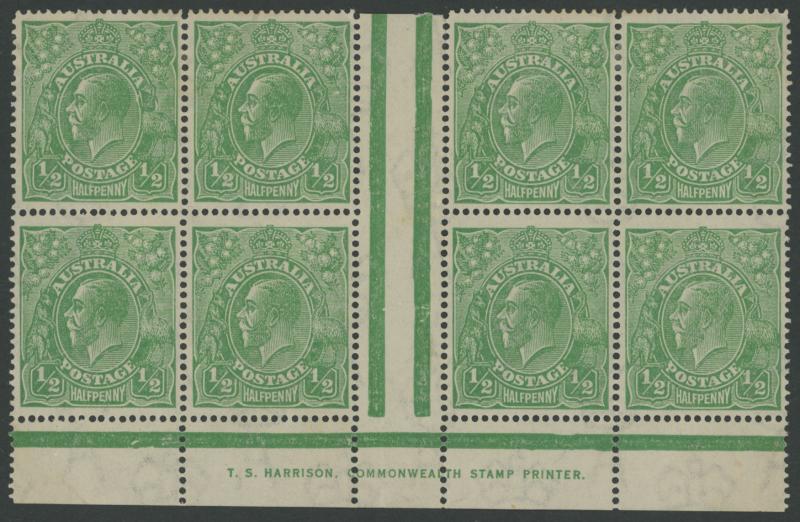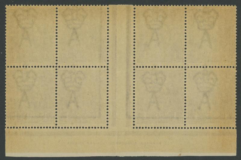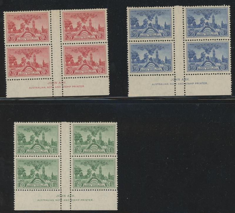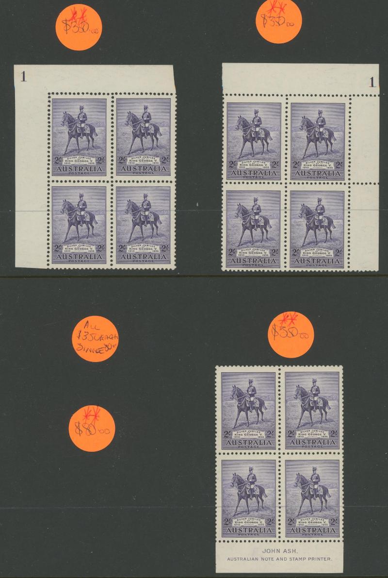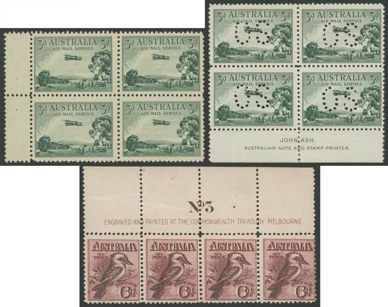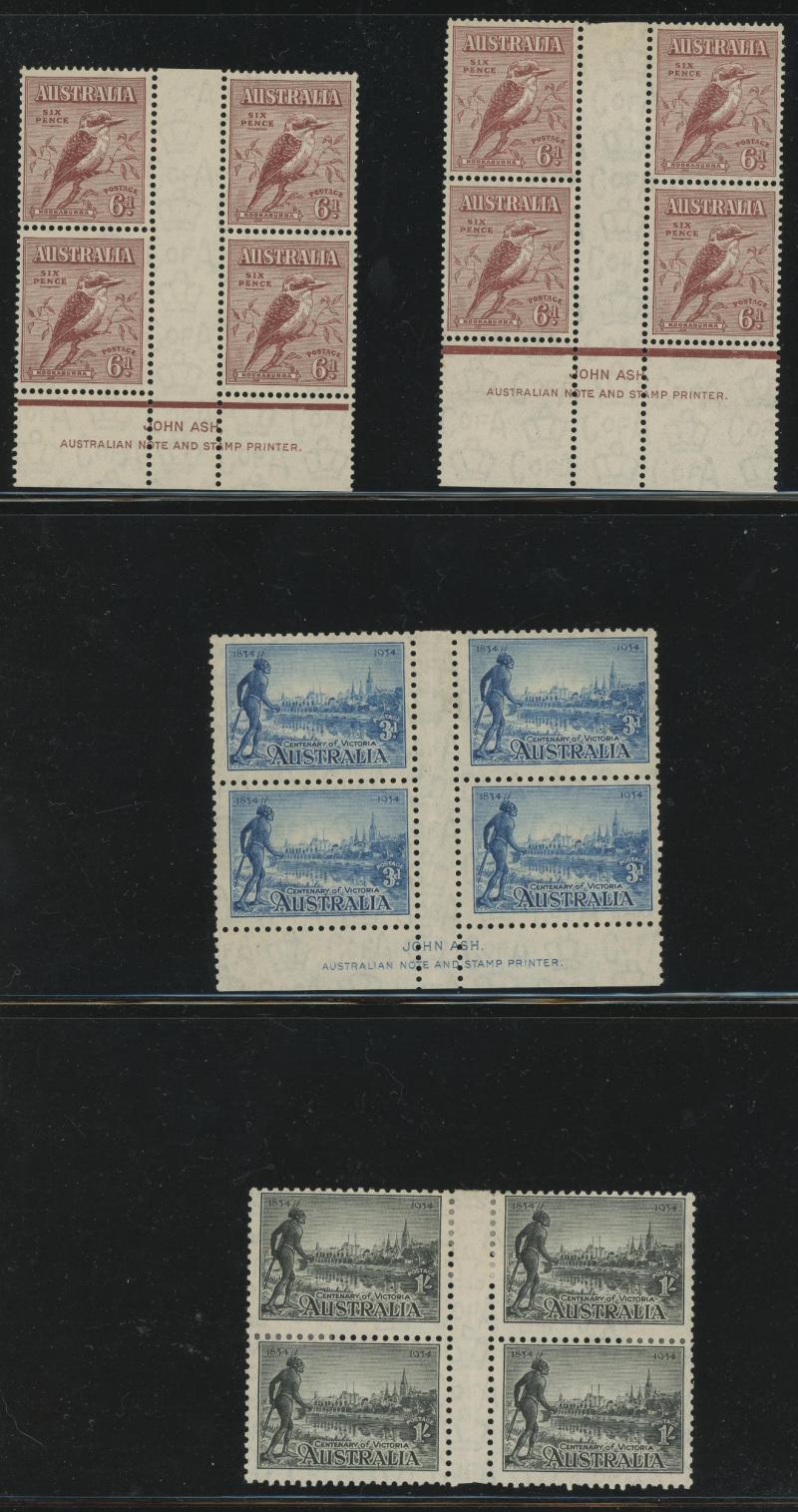 block of 8 */**, 1932 Kookaburra 6d Plate 1 & 2 John Ash Imprint blocks of 4 **, 1934 Victorian Centenary 1/- gutter block of 4 the upper-right unit with Vertical Line through 'R' of 'AUSTRALIA' * (small closed tear), 1934 Hermes John Ash Imprint